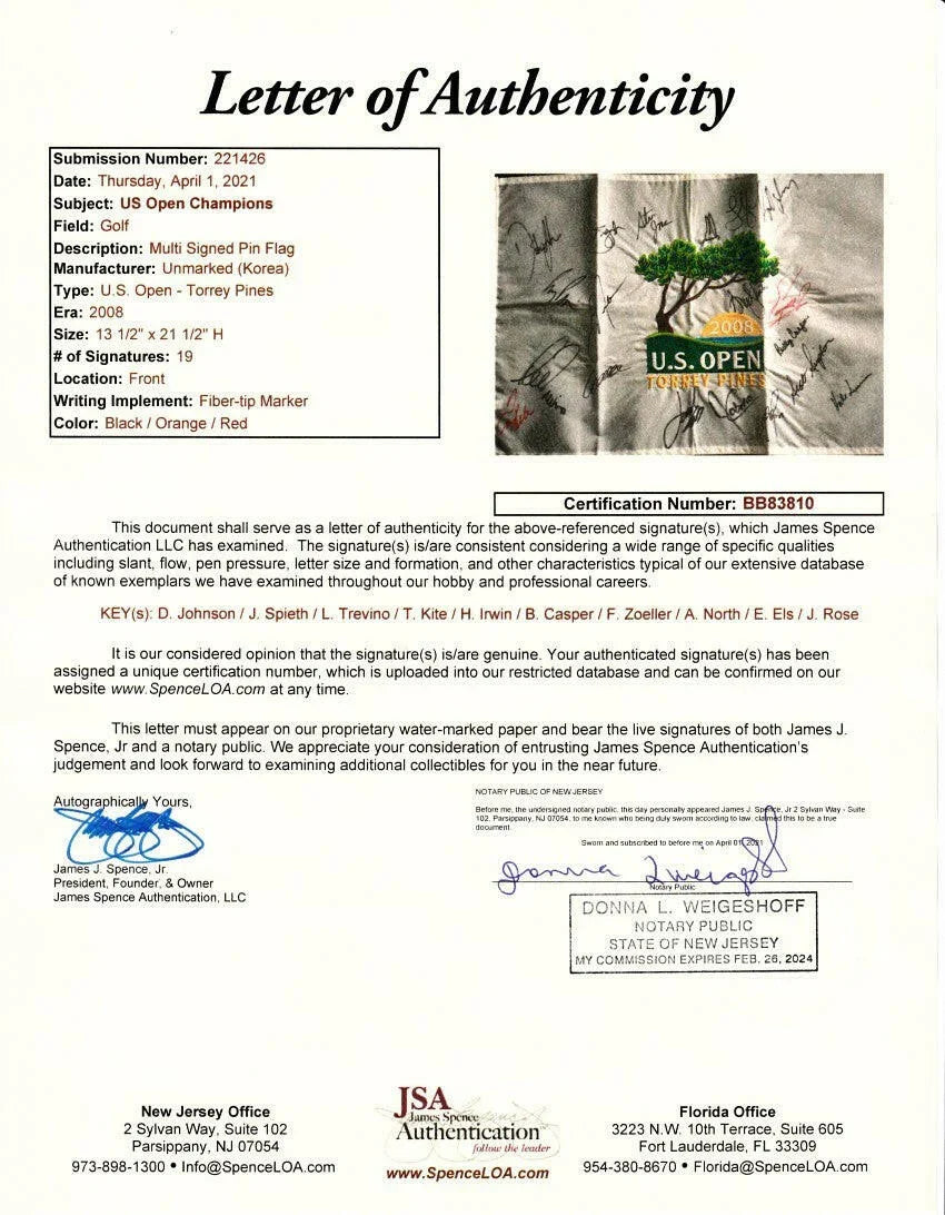 Drapeau de golf brodé blanc de l'US Open 2008 (Torrey Pines) autographié par 19 champions : Billy Casper, Retief Goosen (signature sténotypée de Goose), Ernie Els, Jim Furyk, Andy North, Dustin Johnson, Justin Rose, Lucas Glover, Angel Cabrera, Hale Irwin, Steve Jones, Tom Kite, Larry Nelson, Corey Pavin, Scott Simpson, Geoff Ogilvy, Jordan Spieth, Lee Trevino et Fuzzy Zoeller. Obtenu en personne lors des événements du Southern California PGA Tour et du Champions Tour. Authentifié par JSA avec leur autocollant numéroté correspondant sur le drapeau et la lettre d'authenticité. UN SEUL DISPONIBLE À LA VENTE.