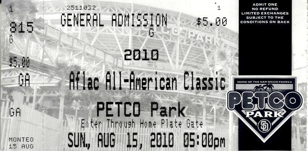Talon de billet original du match de baseball All American des lycées de l'AFLAC de 2010, qui mettait en vedette la future superstar de la MLB Javier Baez et Francisco Lindor alors qu'ils étaient encore amateurs. En superbe état.