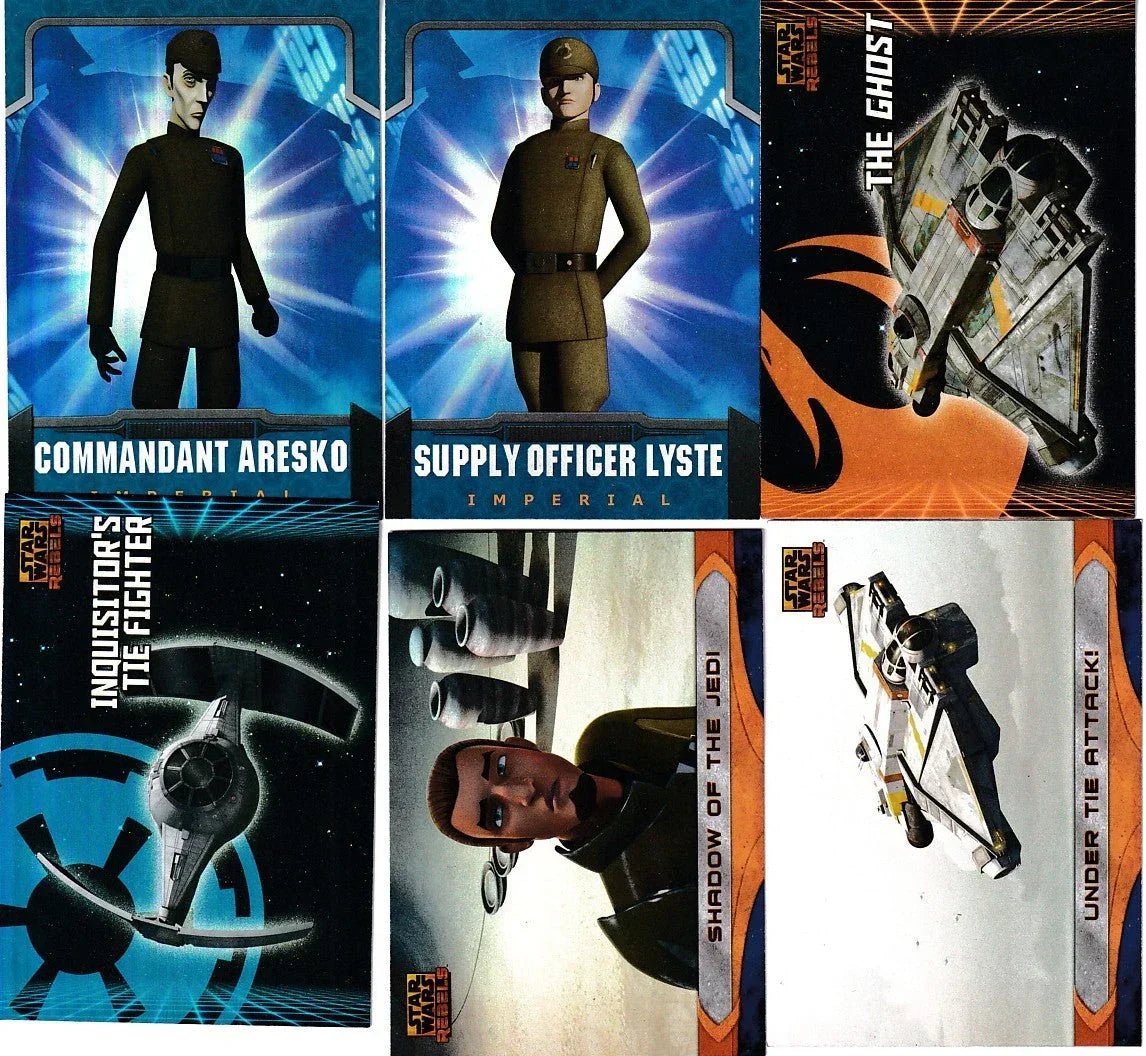 Lot de 6 cartes différentes Star Wars Rebels Rainbow Foil 2015 Topps, à insérer ou à chasser en parallèle, comprenant les numéros de cartes 16, 24, 34, 42, 48 et 52. État neuf ou supérieur. UN SEUL LOT DISPONIBLE À LA VENTE.
