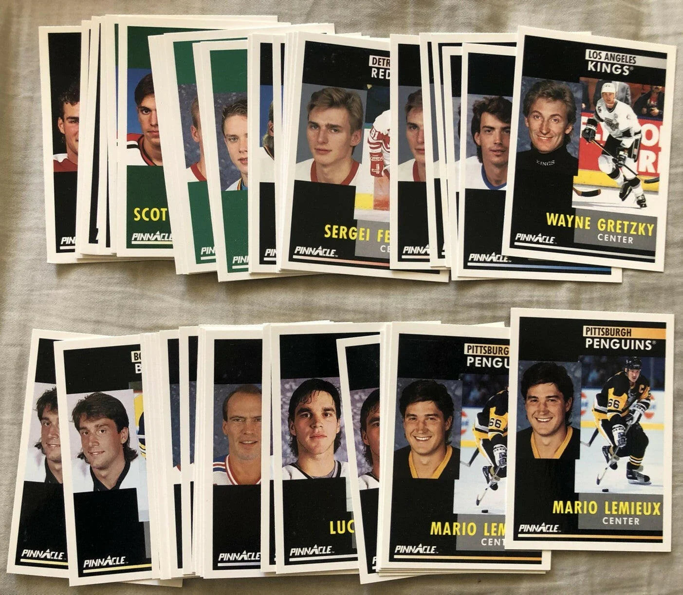 Lot de 46 cartes de hockey Pinnacle de la LNH 1991-92 (presque toutes des cartes de superstars et de recrues, environ la moitié en anglais et la moitié en français) incluant Mario Lemieux (2), Mats Sundin (2), Ray Bourque, Luc Robitaille (2), Mark Messier (2), Jaromir Jagr (2), Chris Chelios (2), Steve Yzerman (5), Cam Neely (2), Wayne Gretzky, Joe Sakic (2), Sergei Fedorov (4), Patrick Roy (2), Brett Hull (2), Pavel Bure (2), Niklas Lidstrom RC (3), John LeClair RC (2), Scott Niedermayer (2), Brett Hull Gamewinners (2) et Eric Lindros (2). État NrMt-Mt ou meilleur. UN SEUL LOT DISPONIBLE À LA VENTE.