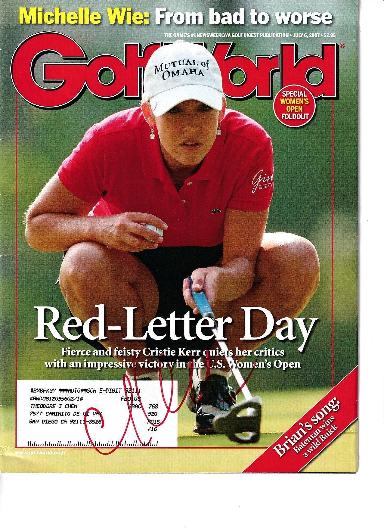 Magazine complet de l'US Women's Open Golf World 2007 autographié au Sharpie rouge sur la couverture par la gagnante et superstar de la LPGA Cristie Kerr. Obtenu en personne. Avec certificat d'authenticité d'AutographsForSale.com. Le magazine présente des défauts et des traces d'usure mineurs. UN SEUL EXEMPLAIRE DISPONIBLE À LA VENTE.