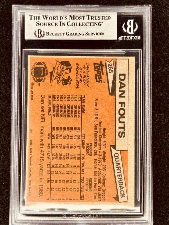 Carte de football Topps 1981 autographiée au Sharpie bleu par le légendaire quarterback des Chargers de San Diego, Dan Fouts, membre du Temple de la renommée. En parfait état (usure au centrage et aux coins). Authentifiée et gravée par Beckett Authentication Services (BAS). SEULEMENT 2 DISPONIBLES À LA VENTE.