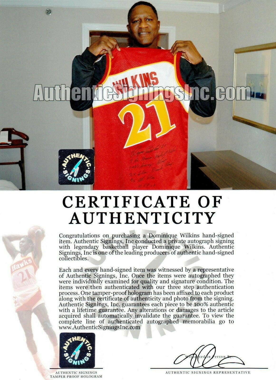Maillot authentique de style Swingman de la saison 1982-83 des Atlanta Hawks de Dominique Wilkins, fabriqué par Adidas avec nom et numéros cousus en une seule couche autographiés au marqueur noir avec 5 inscriptions : The Human Highlight Film, 1986 Scoring Champ, 2X Slam Dunk Champ, 9X All Star et HOF 06. Provenant d'une signature payante avec Authentic Signings, avec leurs hologrammes sur le maillot, photo de la signature et certificat d'authenticité. UN SEUL DISPONIBLE À LA VENTE.