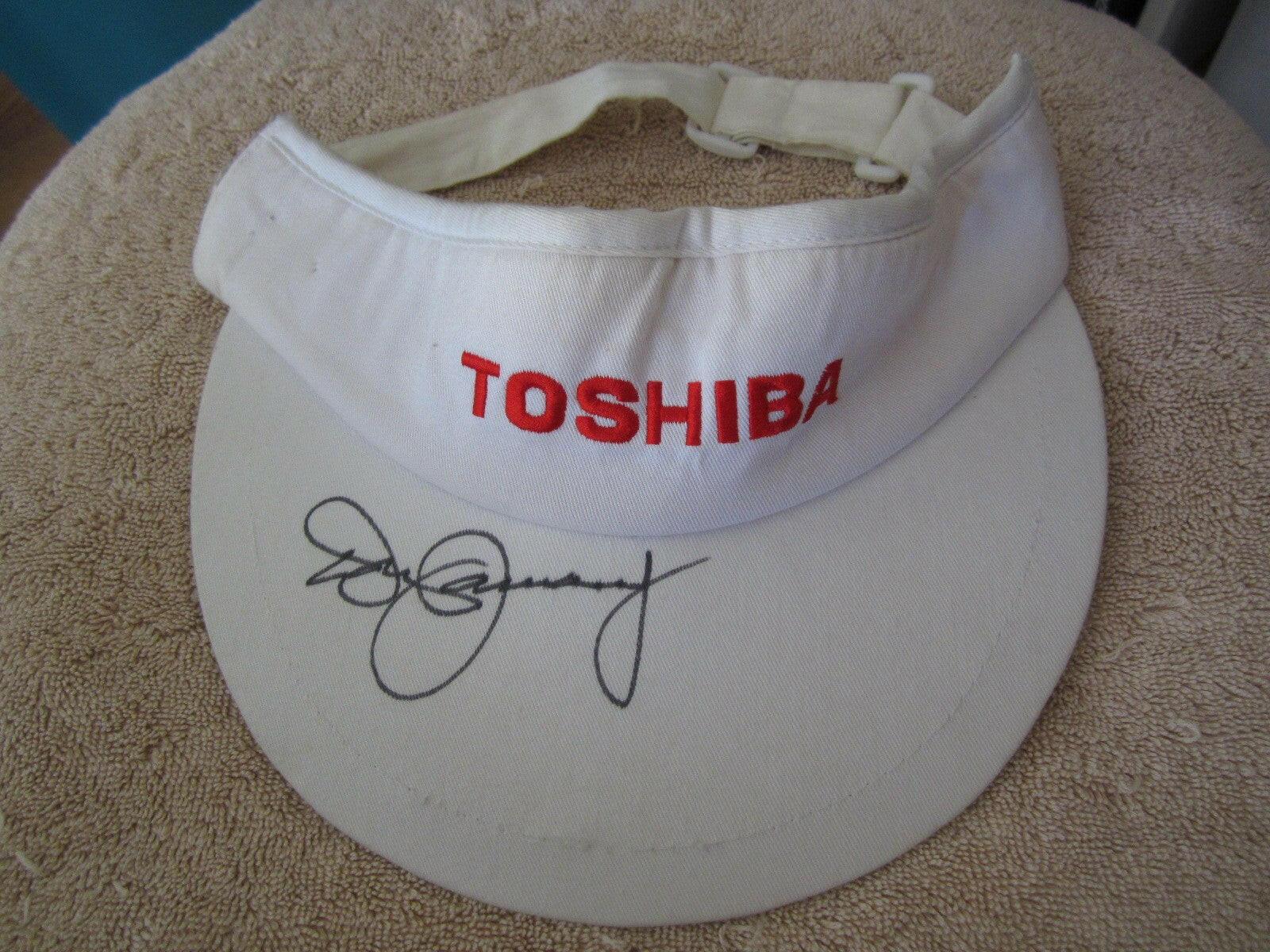 Visière de golf blanche brodée Toshiba Senior Classic autographiée sur la visière au marqueur noir par Don January, vainqueur du championnat PGA 1967. Obtenue en personne, avec certificat d'authenticité d'AutographsForSale.com. Présente des défauts et des traces d'usure mineurs. UN SEUL exemplaire disponible à la vente.
