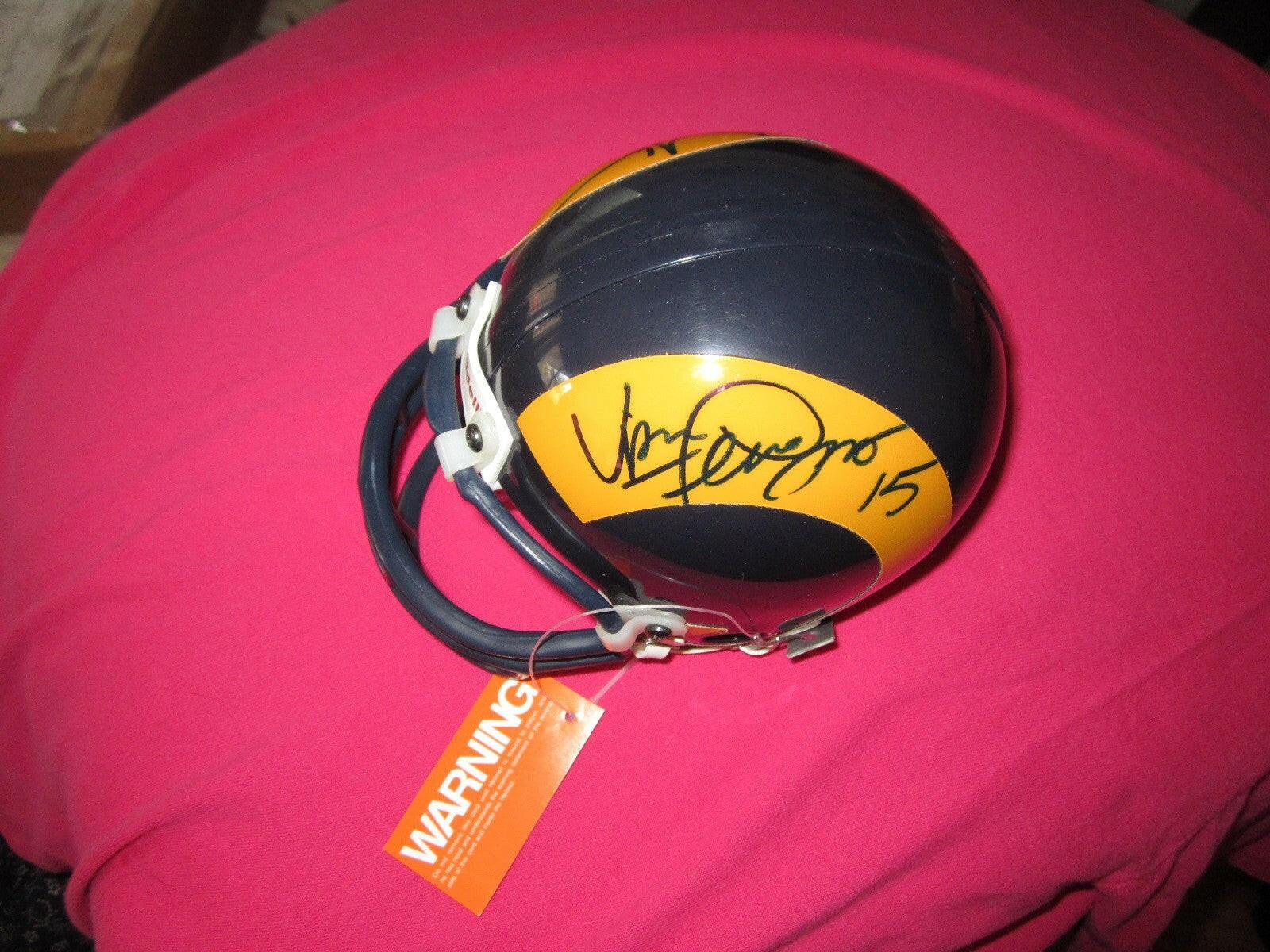 Casque miniature Riddell des Los Angeles Rams autographié au marqueur bleu par les anciennes superstars Eric Dickerson (Pro Football Hall of Famer) et Vince Ferragamo (qui a mené les Rams au Super Bowl 14) sur les côtés opposés. Dickerson et Ferragamo étaient coéquipiers dans les équipes de 1983 et 1984. Les deux autographes ont été obtenus en personne. Authentifié par JSA avec leur autocollant numéroté correspondant au dos et leur carte de certificat d'authenticité. IL N'EN RESTE QU'UN.