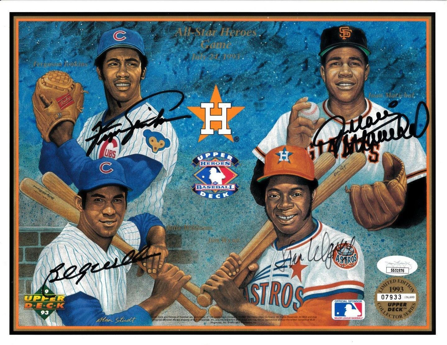 Feuille de cartes commémoratives All-Star Heroes de 8 1/2 x 11 pouces distribuée par Upper Deck en exclusivité lors du match à domicile des Astros de Houston du 24 juillet 1993, autographiée au marqueur noir par les quatre joueurs en vedette : les membres du Temple de la renommée Fergie Jenkins, Juan Marichal et Billy Williams ; plus le grand Jim Wynn des Astros. Présente une usure mineure. Les feuilles entièrement signées sont extrêmement rares. Obtenues en personne. Authentifiées par JSA avec leur autocollant numéroté correspondant sur la feuille et la carte de certificat d'authenticité. UN SEUL DISPONIBLE À LA VENTE.