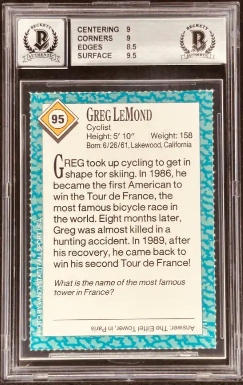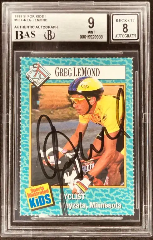 Tour de France winning cyclist Greg LeMond 1989 Sports Illustrated for Kids Rookie Card autographed in black Sharpie, authenticated and slabbed by BAS with the autograph graded 8/10, and the card graded 9 MINT by BGS. LeMond is widely considered the Greatest of All Time (GOAT) of American cyclists since the downfall of Lance Armstrong.