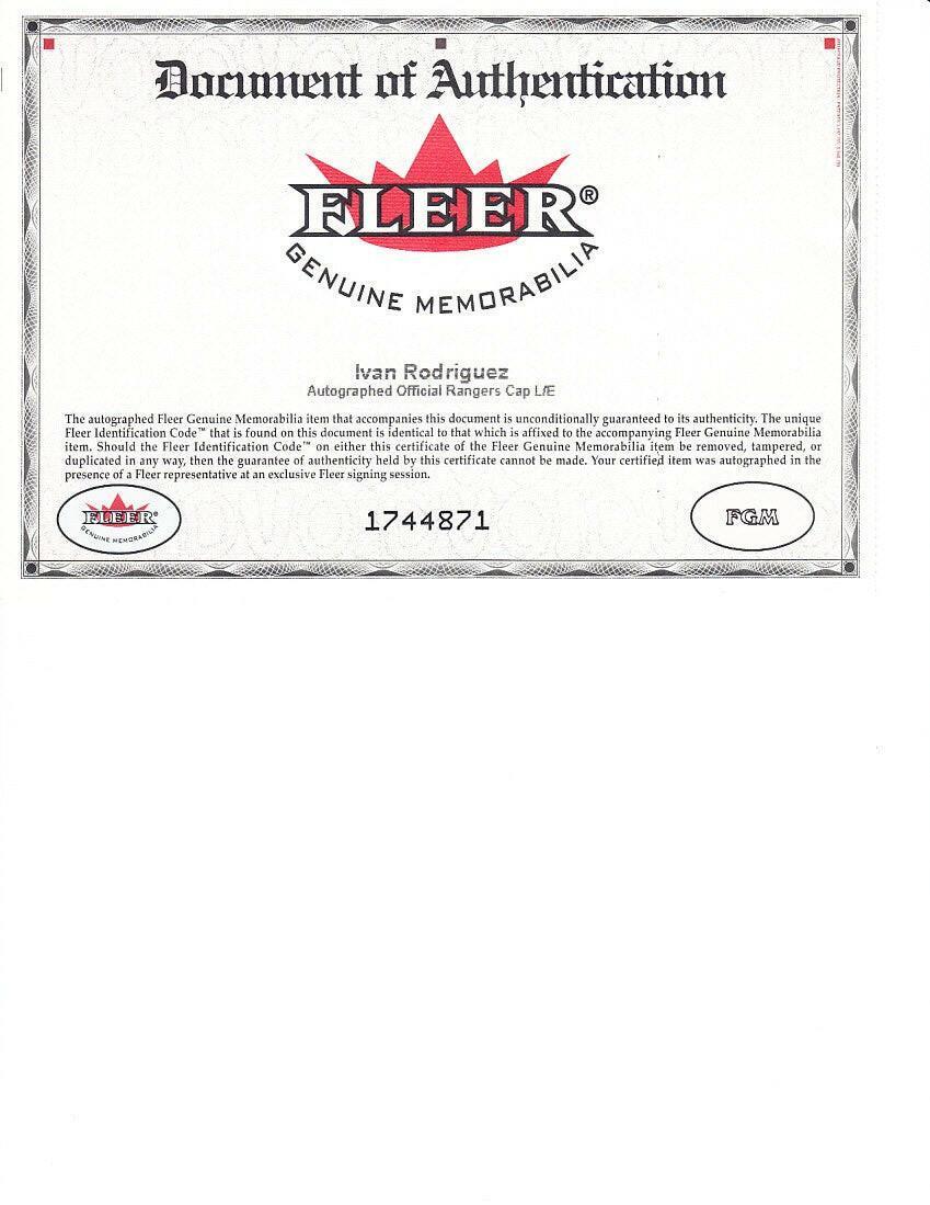 Casquette ou chapeau authentique des Texas Rangers, modèle de jeu, taille 6 7/8, dédicacé à la peinture argentée épaisse sur la visière par l'ancien receveur vedette Ivan Rodriguez. Authentifié par Fleer, avec leur autocollant numéroté correspondant sur le dessous de la casquette et leur certificat d'authenticité. IL NE RESTE QU'UN SEUL.