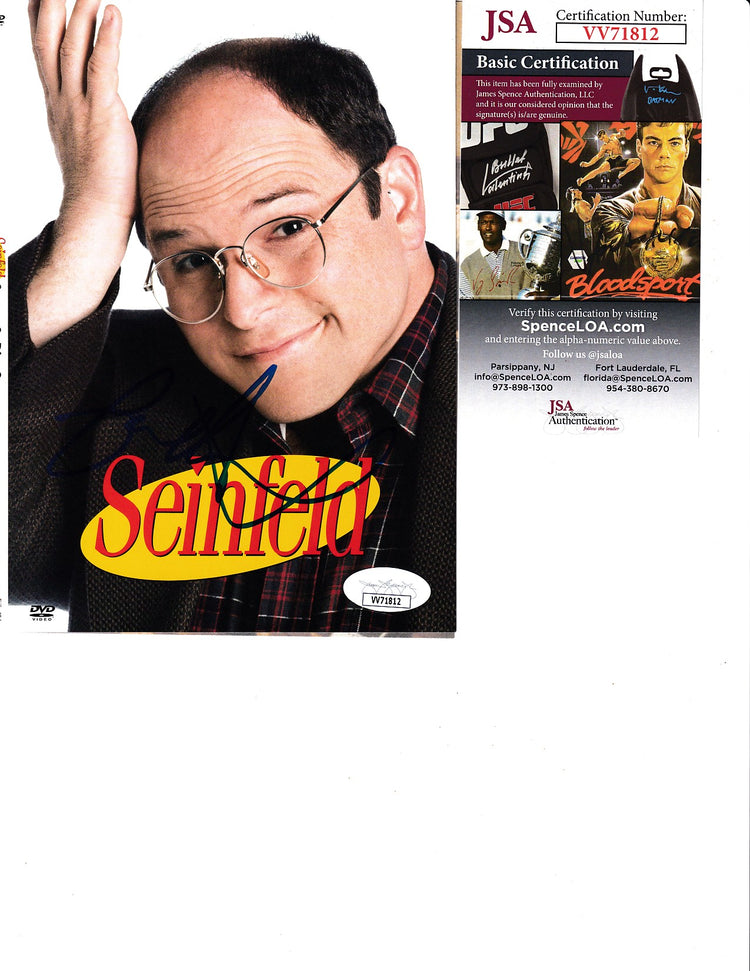 Pochette de DVD de Seinfeld provenant d'un des coffrets avec George Costanza, dédicacée au feutre bleu par l'acteur Jason Alexander. Obtenue en personne. Authentifiée par JSA avec leur autocollant numéroté correspondant sur l'insert et la carte de certificat d'authenticité. DVD NON INCLUS.