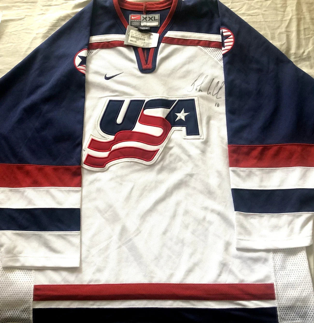 Maillot authentique Nike vierge taille 2XL de l'équipe olympique de hockey des États-Unis de 2002 (sans sangle de combat) autographié au marqueur noir sur le devant par l'intronisé au Temple de la renommée du hockey américain et cinq fois All-Star de la LNH. Authentifié par JSA avec leur autocollant numéroté correspondant sur l'étiquette du col Nike et la carte de certificat d'authenticité. LE MAILLOT EST TOUT NEUF, JAMAIS PORTÉ AVEC L'ÉTIQUETTE EN PAPIER NIKE MAIS A QUELQUES TACHES TRÈS MINEURES PERCEPTIONNABLES LORS D'UNE INSPECTION APPROFONDIE. UN SEUL DISPONIBLE À LA VENTE.