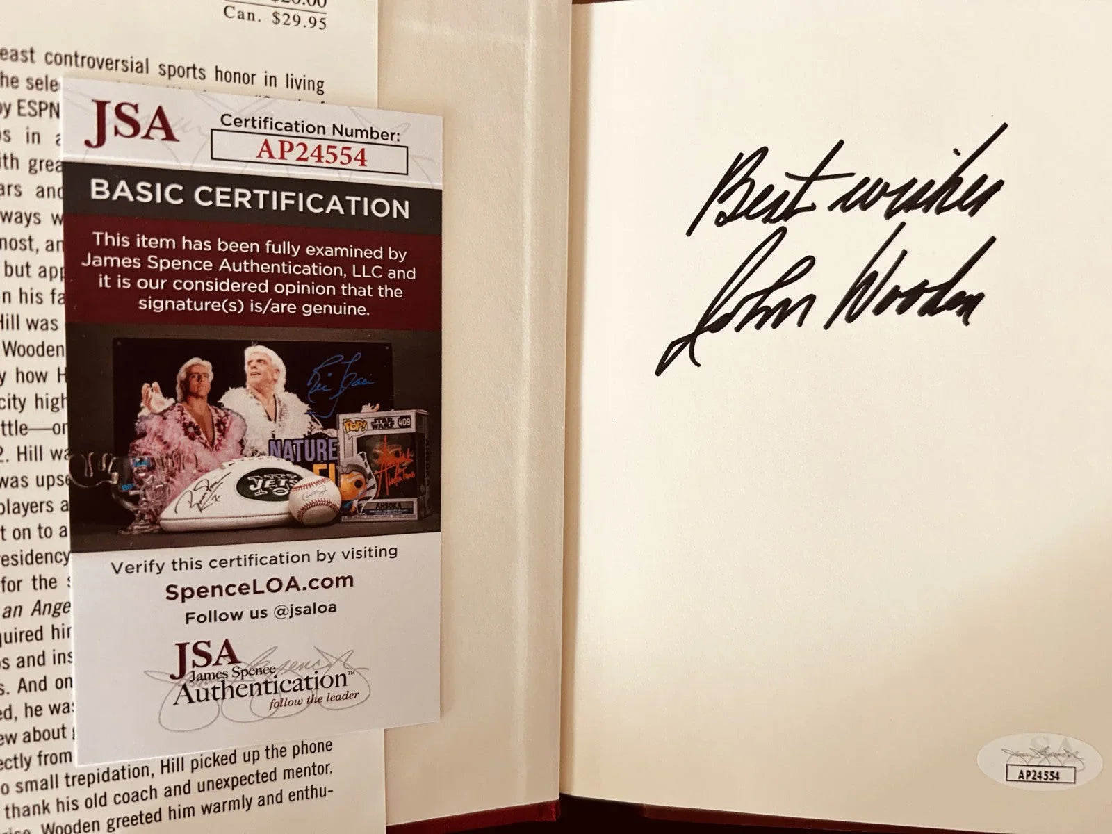 Soyez rapide, mais ne vous pressez pas ! Livre à couverture rigide autographié au marqueur noir sur la couverture intérieure par le regretté et légendaire entraîneur de basket-ball de l'UCLA, John Wooden (il a ajouté "Meilleurs vœux" à sa signature). Authentifié par JSA avec leur autocollant numéroté correspondant apposé sur la page signée et la carte de certificat d'authenticité. IL N'EN RESTE QU'UN.