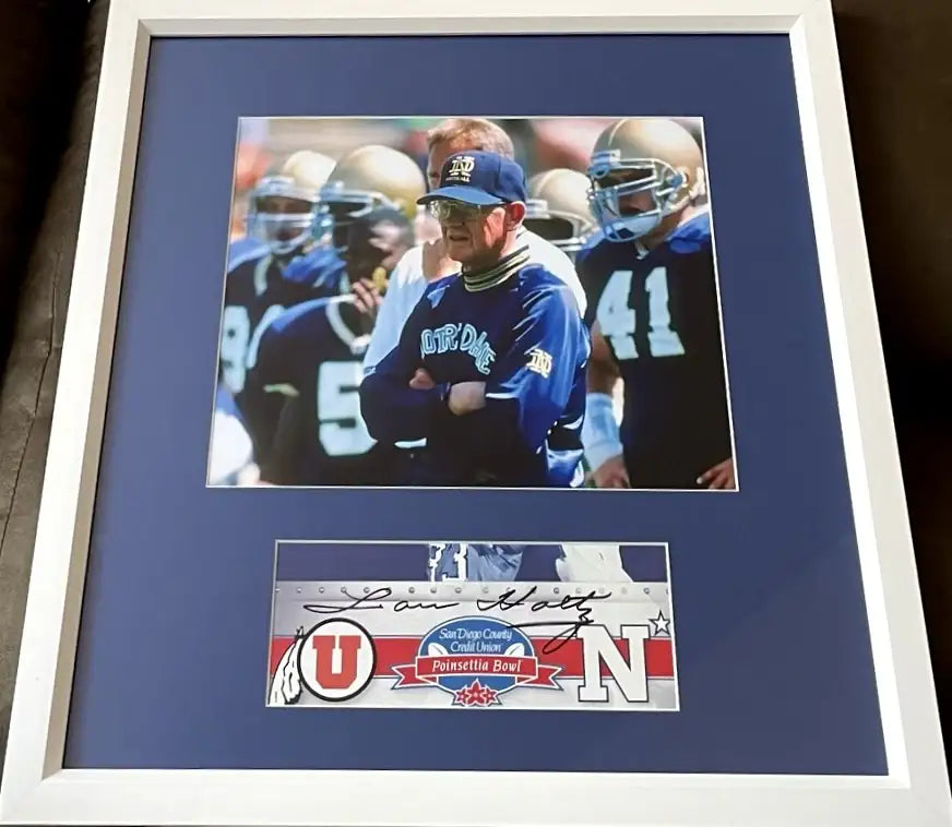 Autographe signé au marqueur noir sur papier blanc par le légendaire entraîneur de football des Fighting Irish de Notre Dame, Lou Holtz, professionnellement encadré en bleu avec une photo vintage 8x10 et encadré avec verre en bois blanc, prêt à accrocher. Authentifié par JSA avec leur autocollant numéroté correspondant sur le papier et la carte de certificat d'authenticité. La taille encadrée est d'environ 15 1/2 pouces carrés. UN SEUL DISPONIBLE À LA VENTE.