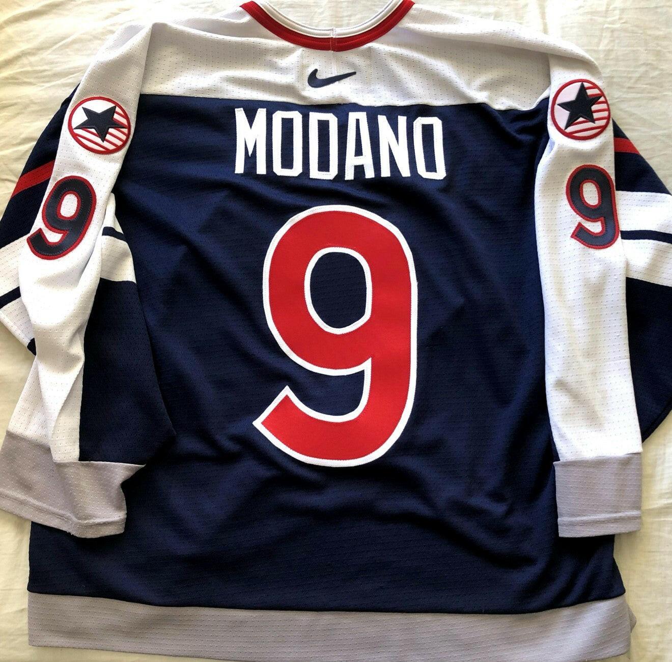 Maillot authentique Nike cousu de Mike Modano 1998 USA Olympic Hockey Team (sans sangle de combat) avec nom et numéros cousus en tissu sergé double couche. Semble neuf à première vue mais présente de minuscules marques et entailles sur le tissu (les coutures sont neuves). UN SEUL DE CHAQUE TAILLE DISPONIBLE À LA VENTE.