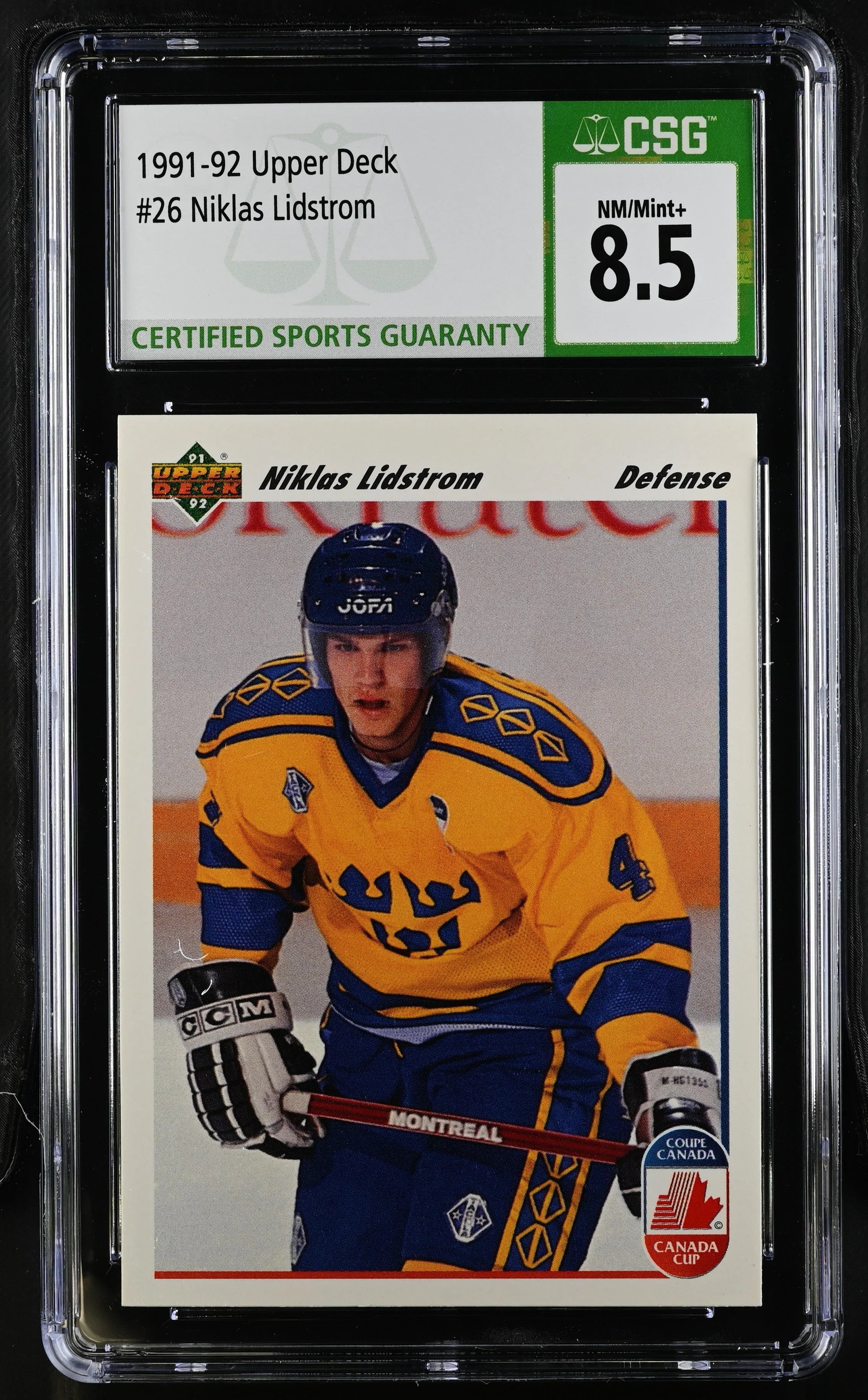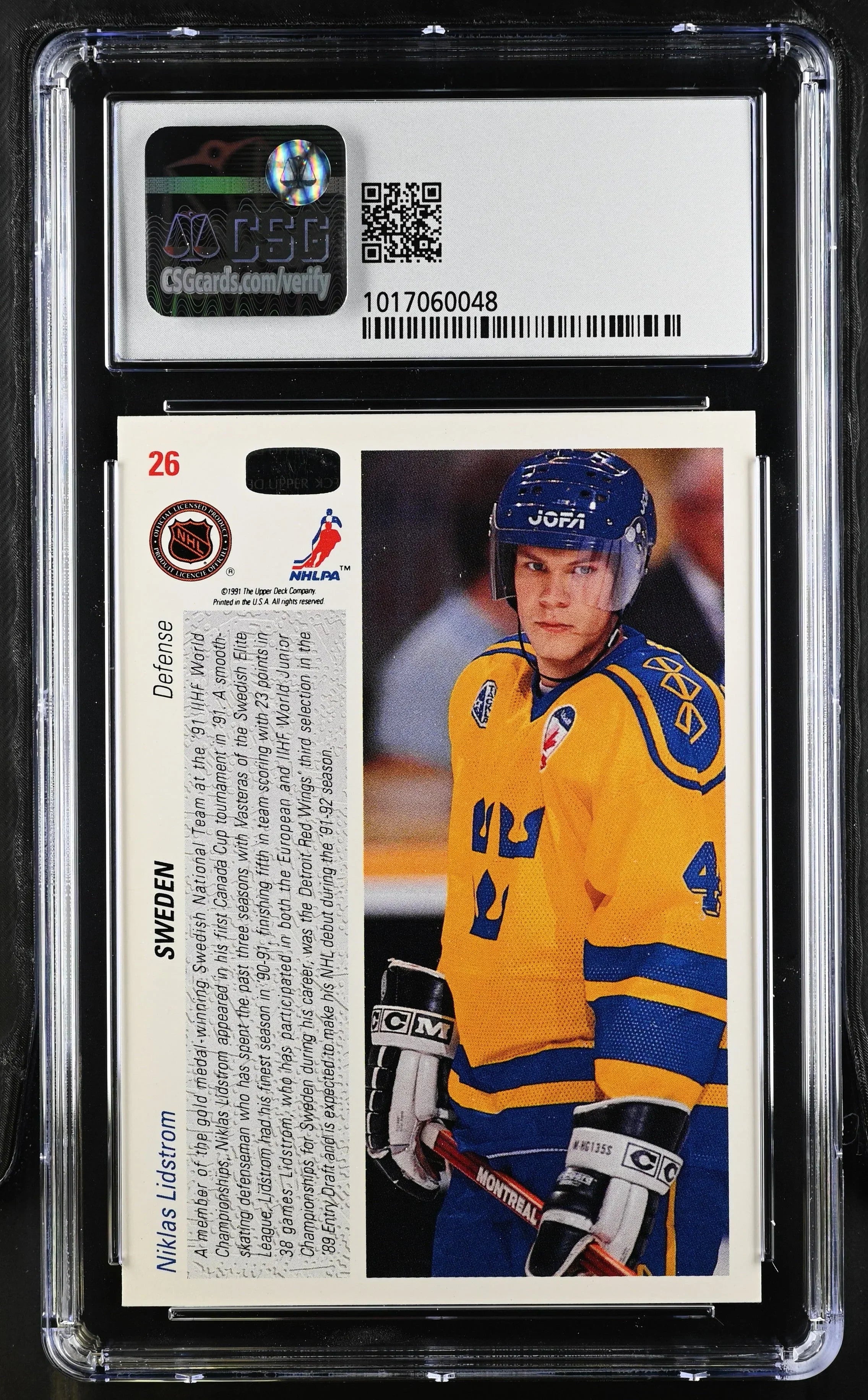 Nicklas (Niklas) Lidstrom Carte recrue Upper Deck de l'équipe nationale suédoise 1991-92 n° 26 classée 8,5 NrMt-Mt+ par Certified Sports Guaranty (CSG). UN SEUL DISPONIBLE À LA VENTE.
