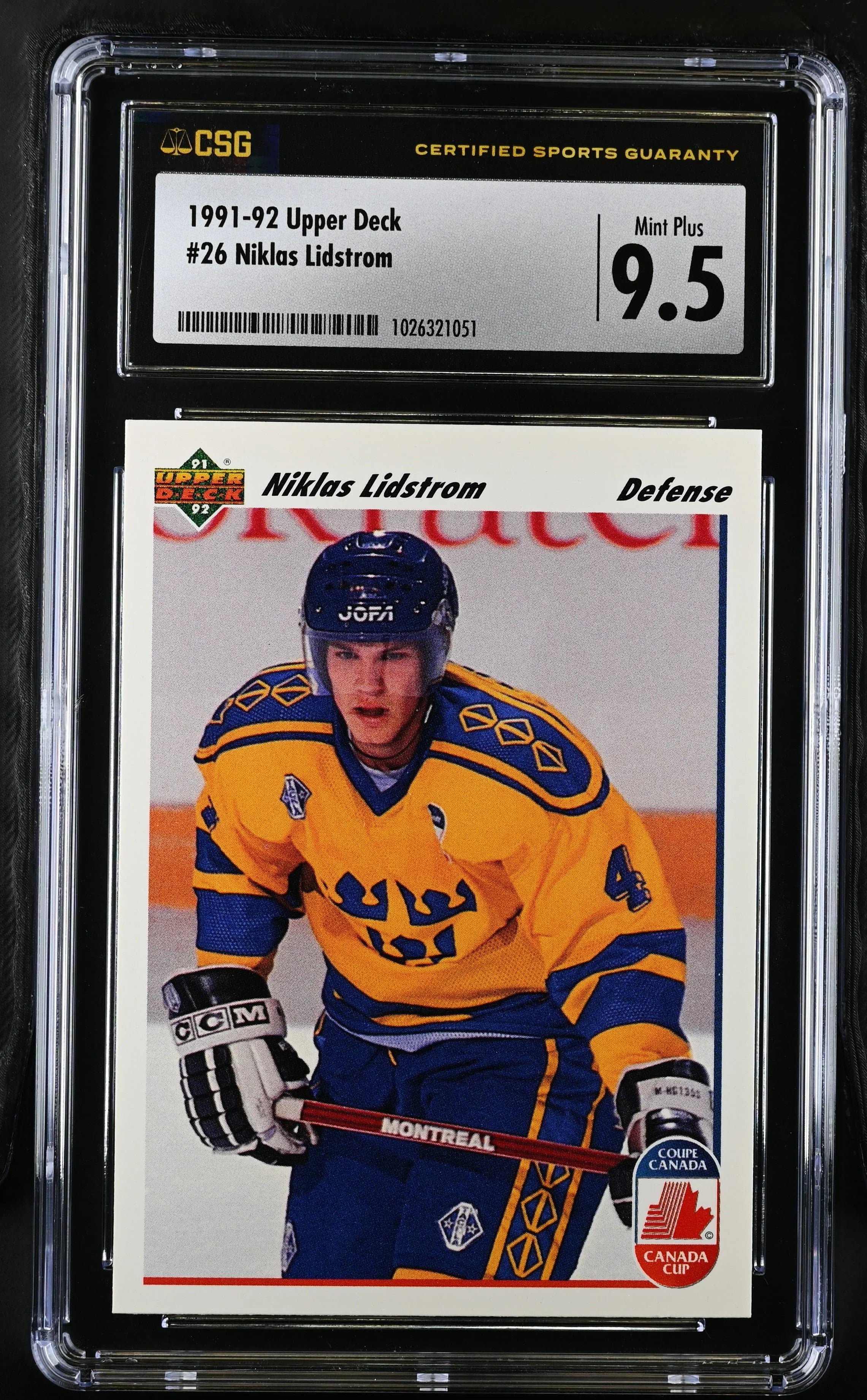 Carte de recrue Upper Deck #26 de l'équipe nationale suédoise de Nicklas (Niklas) Lidstrom 1991-92 classée 9,5 MINT PLUS (GEM MINT) par Certified Sports Guaranty (CSG). UN SEUL EXEMPLAIRE DISPONIBLE À LA VENTE.