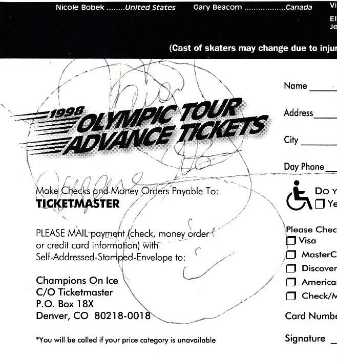 Autographe signé au marqueur noir fin sur une copie 4x4 pouces découpée à partir d'un bon de commande de billets pour Champions on Ice 1998 par Oksana Baiul, patineuse artistique médaillée d'or olympique de 1994, encadrée professionnellement en noir avec une photo 8x10 d'elle lors de sa performance au programme court, encadrée avec du verre en bois blanc, prête à accrocher. La taille encadrée est un peu plus petite que 14 par 20 pouces. Obtenu en personne après un spectacle Champions on Ice de 1997 à Denver, avec talon de billet original et certificat d'authenticité d'AutographsForSale.com. UN SEUL DISPONIBLE À LA VENTE.