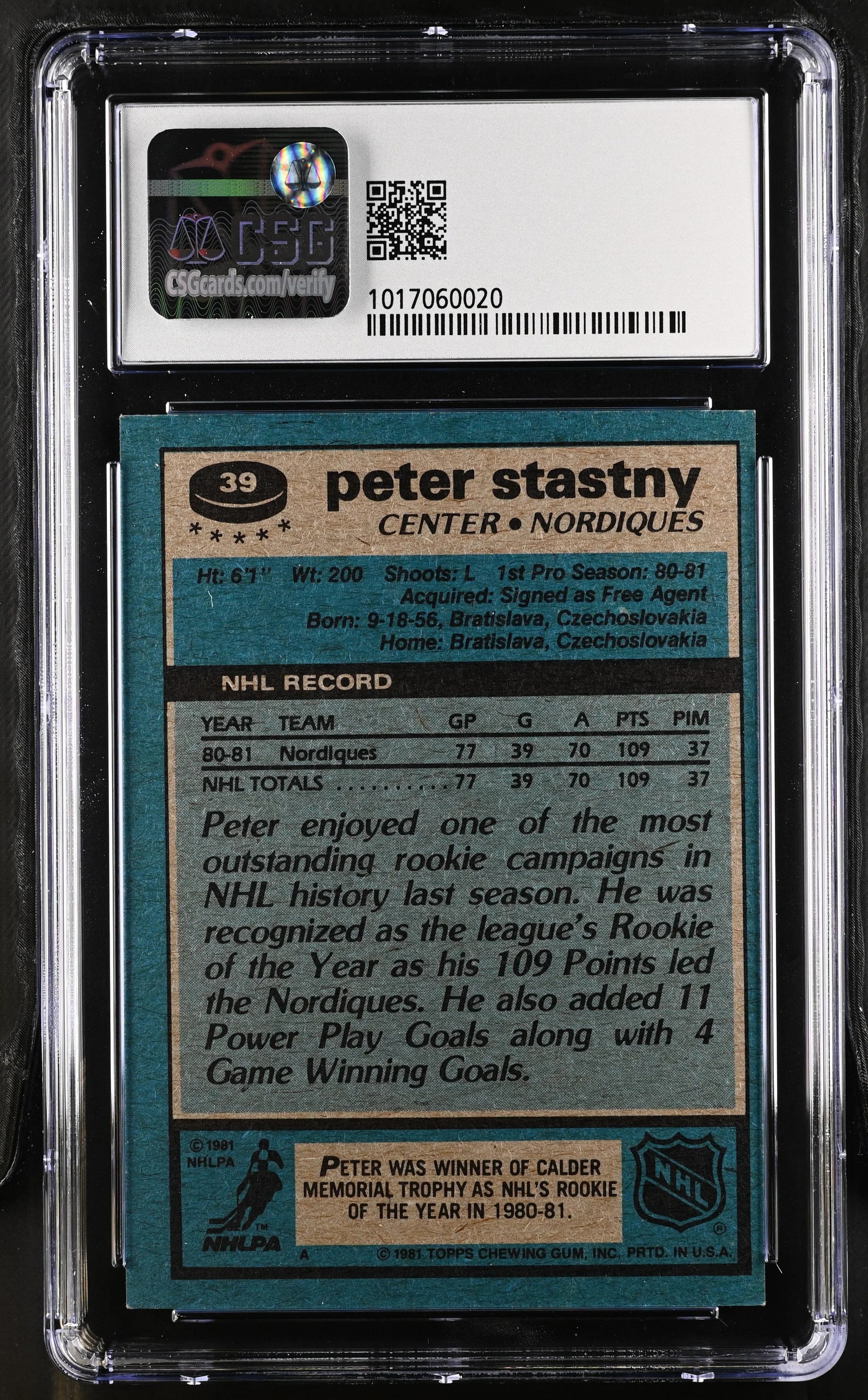 Carte recrue Topps 1981-82 des Nordiques de Québec de Peter Stastny #39 classée 7 (Near Mint) par Certified Sports Guaranty (CSG).