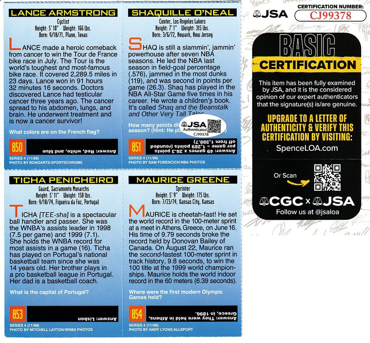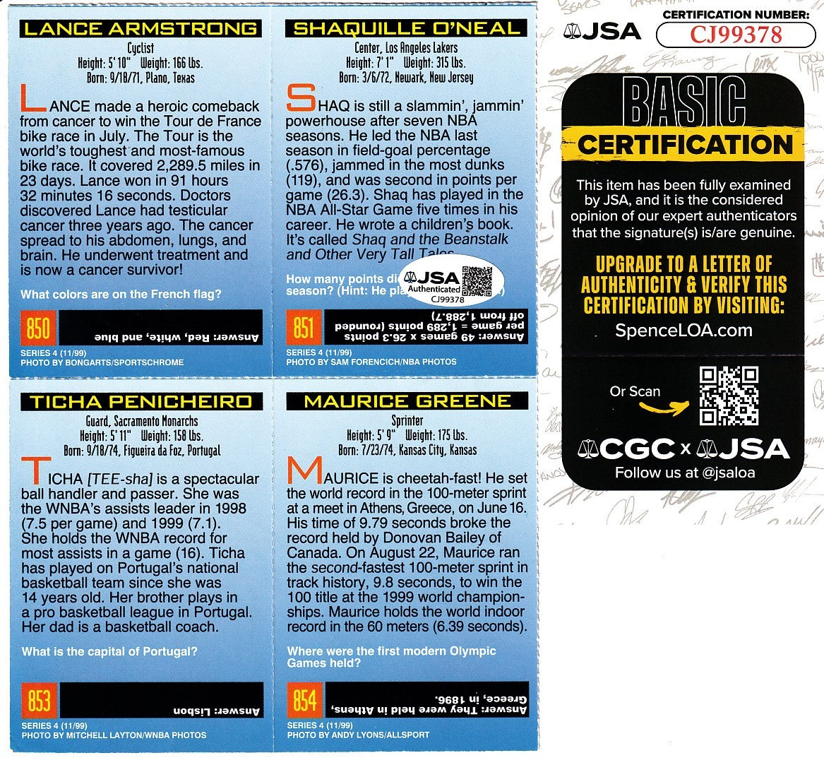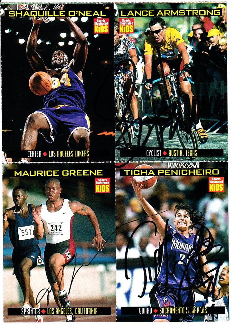 November 1999 Sports Illustrated for Kids perforated 4-card panel autographed in black Sharpie by three legendary athletes: