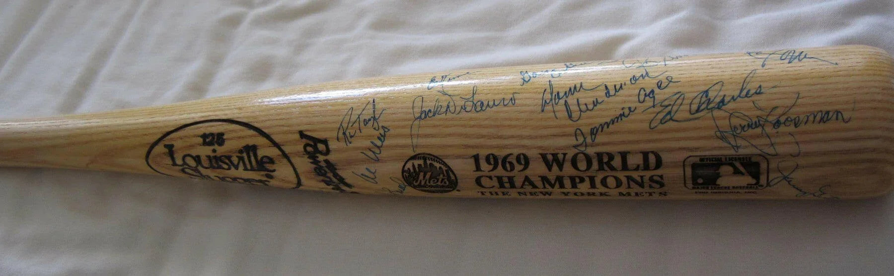 ルイビルスラッガーのフルサイズ記念バットに、1969年ワールドシリーズ優勝チーム、ニューヨークメッツのメンバー21名が薄い青いマーカーでサインしました: ジェリー・グロート、エド・クレインプール、ケン・ボズウェル、バド・ハレルソン (小さな汚れあり)、ウェイン・ギャレット、クレオン・ジョーンズ、トミー・エイジー (故人)、ロン・スウォボダ、アート・シャムスキー、アル・ワイス、ロッド・ガスパー、ドン・クレンデノン (故人)、JC マーティン、エド・チャールズ、ジェリー・クーズマン、ゲイリー・ジェントリー、ドン・カードウェル、ジム・マクアンドリュー、カル・クーンセ、ジャック・ディラウロ、ロン・テイラー。ジョーン・ホッジス (ギル・ホッジスの未亡人) のサインもあり、合計22名のサインがあります。1990年代の再会サイン会でのもの。JSAによる認証済みで、バットにはメンバーの番号入りステッカーが貼られ、認証書も付属。透明プラスチックバットチューブが付属。販売できるのは 1 つだけです。