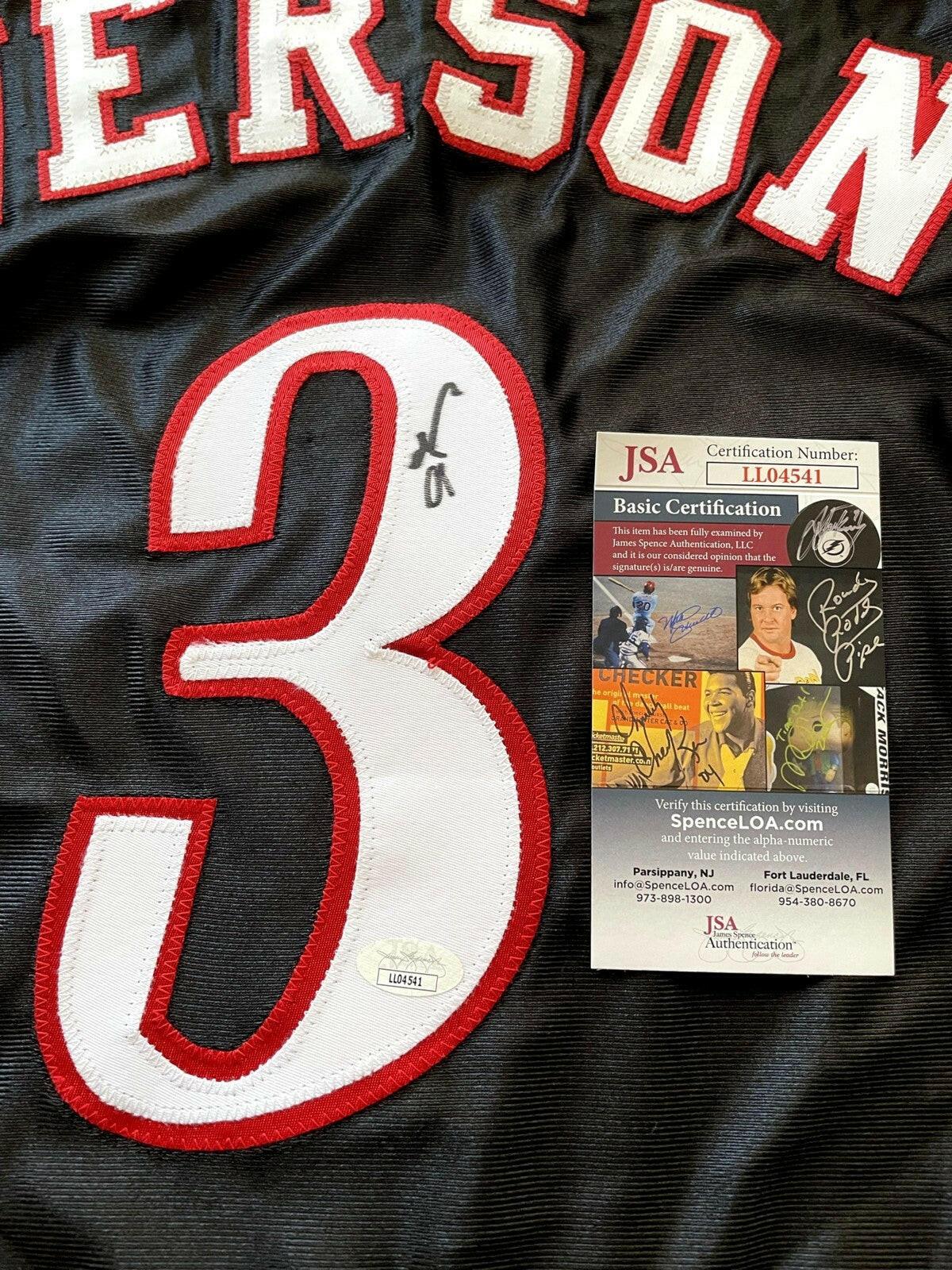 フィラデルフィア 76ers の正規アディダス ブラック ゲーム モデル サイズ 56 ジャージ。殿堂入り選手アレン アイバーソンが背中の 3 番に黒のシャーピーでサインしています。JSA によって認証された有料サインで、ジャージに一致する番号のステッカーと真正性証明書が貼られています。ジャージにはごくわずかな生地の欠陥があります (ステッチは新品です)。販売できるのは 1 枚のみです。