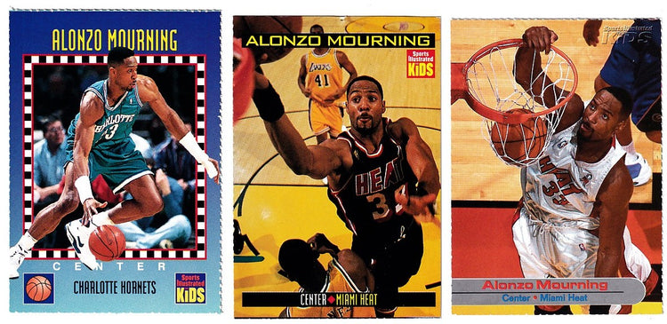 スポーツ イラストレイテッド フォー キッズ カード 2 枚セット。バスケットボール殿堂入り選手アロンゾ モーニング: 1994 年 (シャーロット ホーネッツ) と 2000 年 (子供の写真)。カードには一般的なミシン目が付いていますが、2000 年のカードはカットミスのため通常より短くなっています。販売できるのは 1 セットのみです。