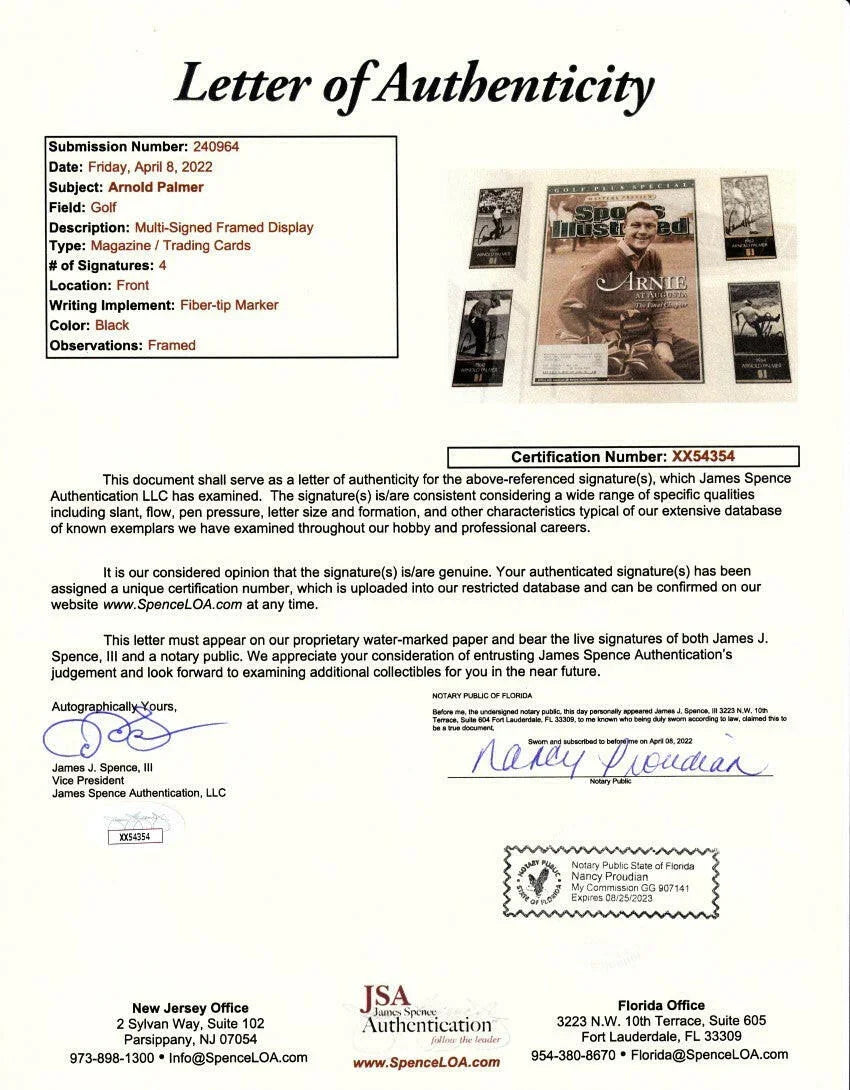 1958、1960、1962、1964年のマスターズチャンピオンカード(オーガスタでの4回の優勝すべてを表現)は、伝説のアーノルド・パーマーによってそれぞれ黒のマーカーで個別にサインされており、プロによるマット加工が施され、2004年に彼がマスターズに別れを告げたときに発行されたアーニー・アット・オーガスタのスポーツイラストレイテッドゴルフプラスの表紙とともに額装されています。額装サイズは約16 x 21インチです。何年も前にボブ・ホープ・クライスラークラシックゴルフトーナメントで直接入手しました。すぐに掛けられます。JSAによって認証され、署名の写真を示す証明書が付いています。販売できるのは1枚のみです。