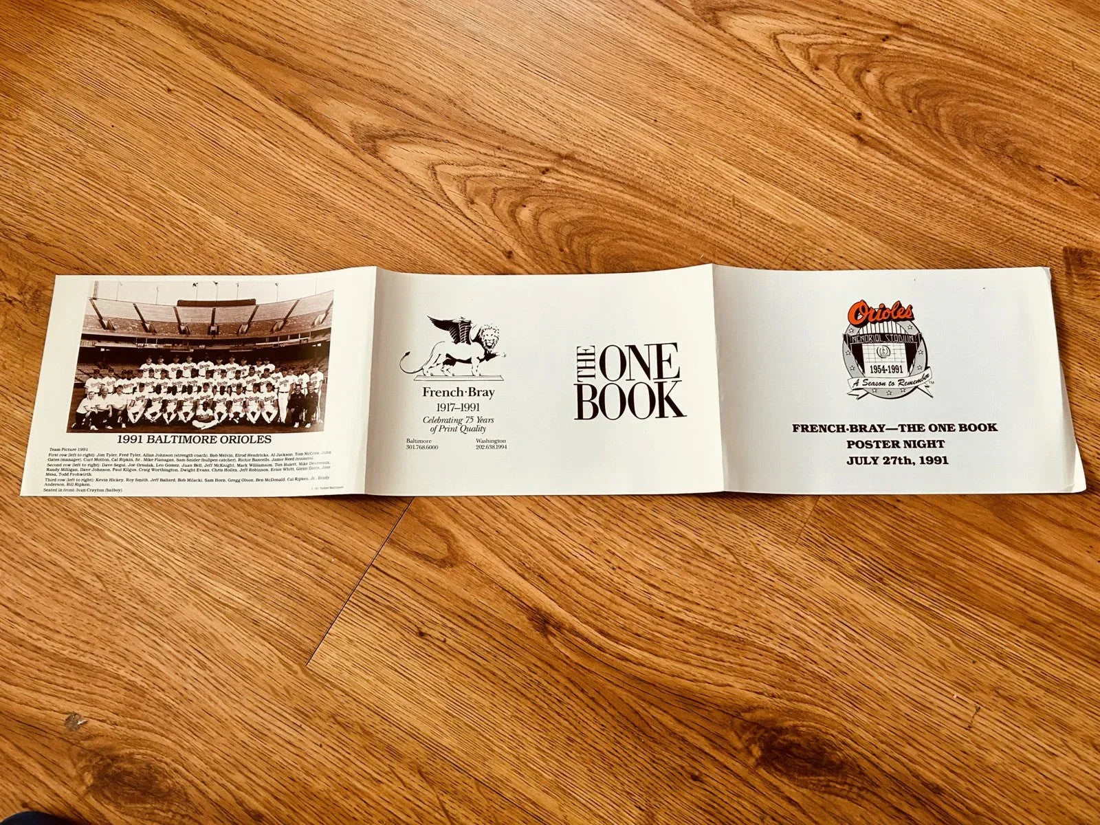 ボルチモア オリオールズ メモリアル スタジアム 1991 最後の開幕戦の折り込みポスターとチーム写真。French-Bray 社が発行し、1991 年 7 月 27 日のホーム ゲームでのみ配布されました。表紙の右端にひどい折り目があります。販売できるのは 1 点のみです。