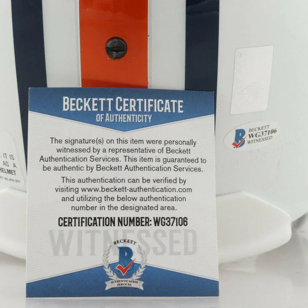 オーバーン タイガースの Riddell フルサイズ レプリカ ヘルメット。伝説のハイズマン賞受賞者 Bo Jackson が黒のシャーピーでサインしました。Beckett Authentication Services によって認証された有料サインです。ヘルメットには Bo の個人ホログラムと BAS 一致番号ステッカーが貼られ、真正性証明書カードが付属します。販売できるのは 1 つだけです。