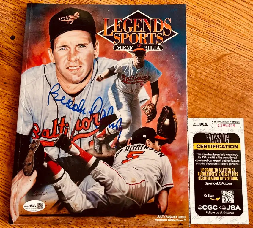 1993 年 7 月/8 月号の Legends マガジン (ニューススタンド版の表紙) に、伝説のボルチモア オリオールズの殿堂入り三塁手、ブルックス ロビンソンのサインが入っています。わずかな摩耗があります。AutographsForSale.com 発行の真正証明書付き。販売できるのは 1 点のみです。
