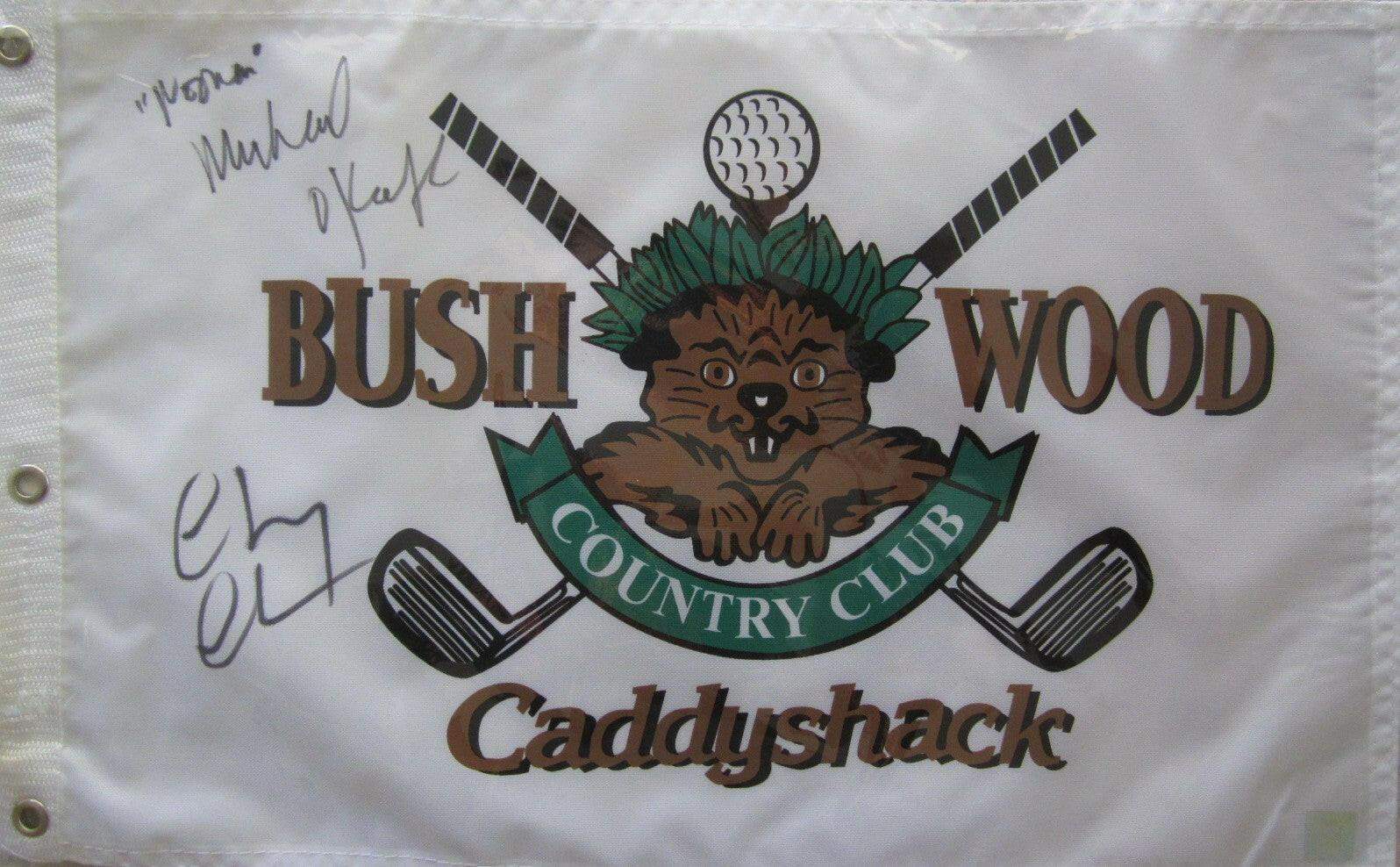 映画「キャディシャック」のブッシュウッド カントリー クラブ ゴルフ ピン フラッグ。有名なホリネズミのロゴ入り。このクラシック コメディでタイ ウェブとダニー ヌーナン役で共演したチェビー チェイスとマイケル オキーフが黒のシャーピーでサインしました。オキーフは自分のサインにヌーナンも加えました。スーパースター グリーティングとの個別のプライベート サイン会で、フラッグのホログラム、サイン会の写真、真正証明書で認証されています。注: これらのサイン会で複数のフラッグを入手したため、サインと位置が若干異なります。残り 4 個のみ。