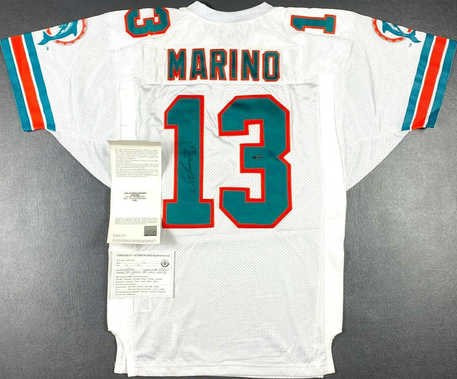 Wilson NFL Pro Line ゲームモデル 1996 マイアミ ドルフィンズ ホワイト サイズ 46 ジャージ、NFL シールド ロゴ カラー パッチ、ステッチ入りダブル レイヤー タックル ツイル ネームと番号、伸縮性のあるサイド、背面 1 に伝説の QB ダン マリーノによる黒のシャーピーによるサイン (フルネーム)。UDA の特許取得済み 3 段階プロセスにより認証され、背面 3 の一致する番号付きホログラムと真正証明書が含まれます。販売可能なのは 1 枚のみです。