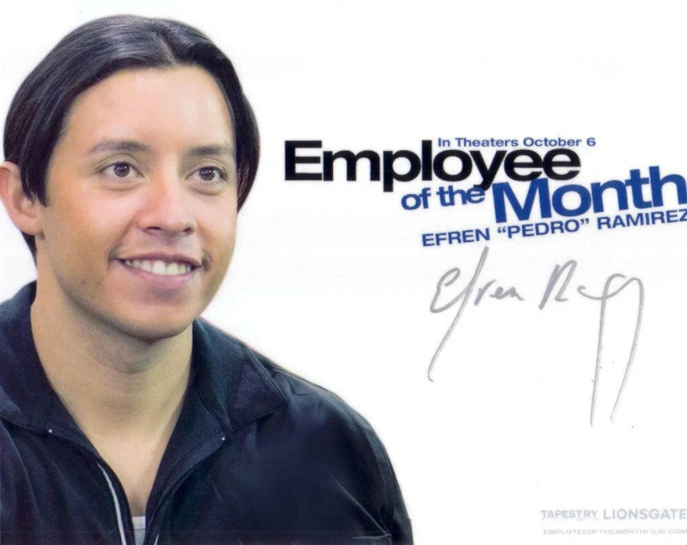 2006 年のコメディ映画「今月の従業員」の 8x10 プロモーション写真。俳優のエフレン・ラミレスが銀色のシャーピーでサインしました。ラミネート加工されています。何年も前にサンディエゴ コミック コンで直接入手しました。AutographsForSale.com の真正証明書付き。販売できるのは 1 枚のみです。