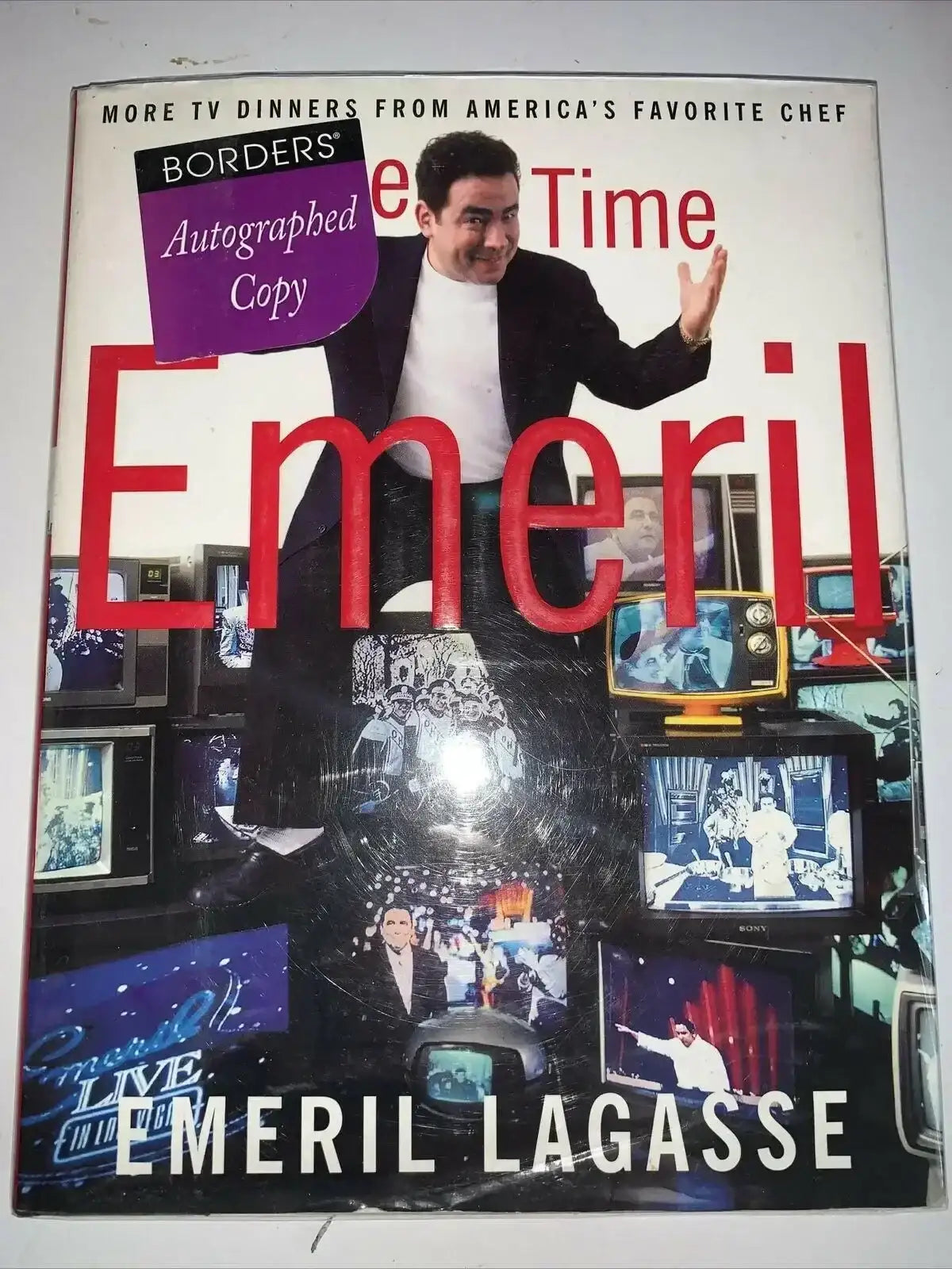 プライム タイム エメリル ハードカバー クックブック。著者であり有名シェフでもあるエメリル ラガッセが、表紙の内側に黒いシャーピーでサインしています。透明のダスト ジャケット カバー付き。AutographsForSale.com 発行の真正証明書付き。販売できるのは 2 冊のみです。
