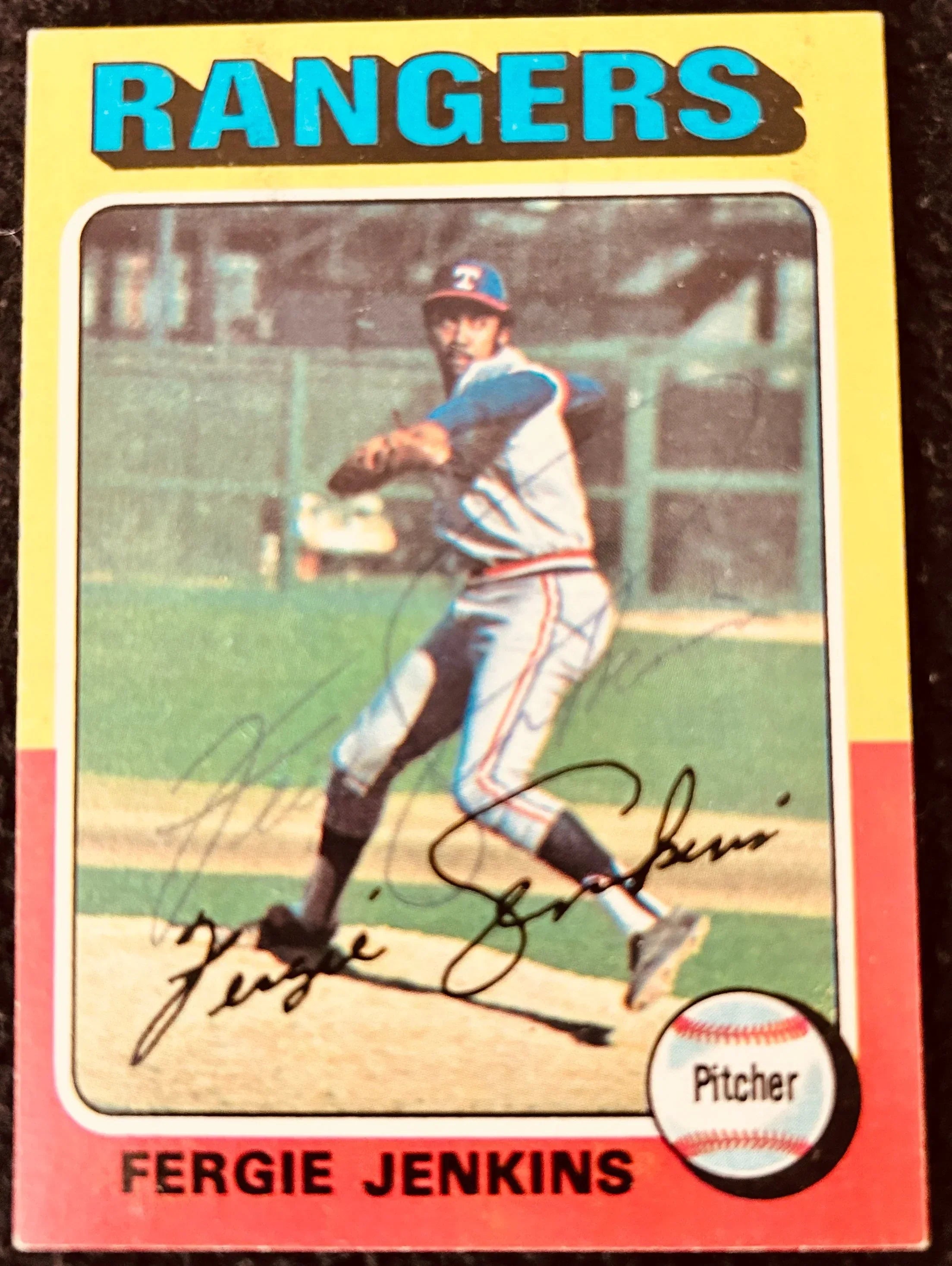 テキサス レンジャーズの 1975 Topps カードに、殿堂入り投手ファーギー ジェンキンスがボールペンでサインしました。本人から入手。AutographsForSale.com 発行の真正証明書付き。状態はほぼ NrMt。販売できるのは 1 枚のみです。