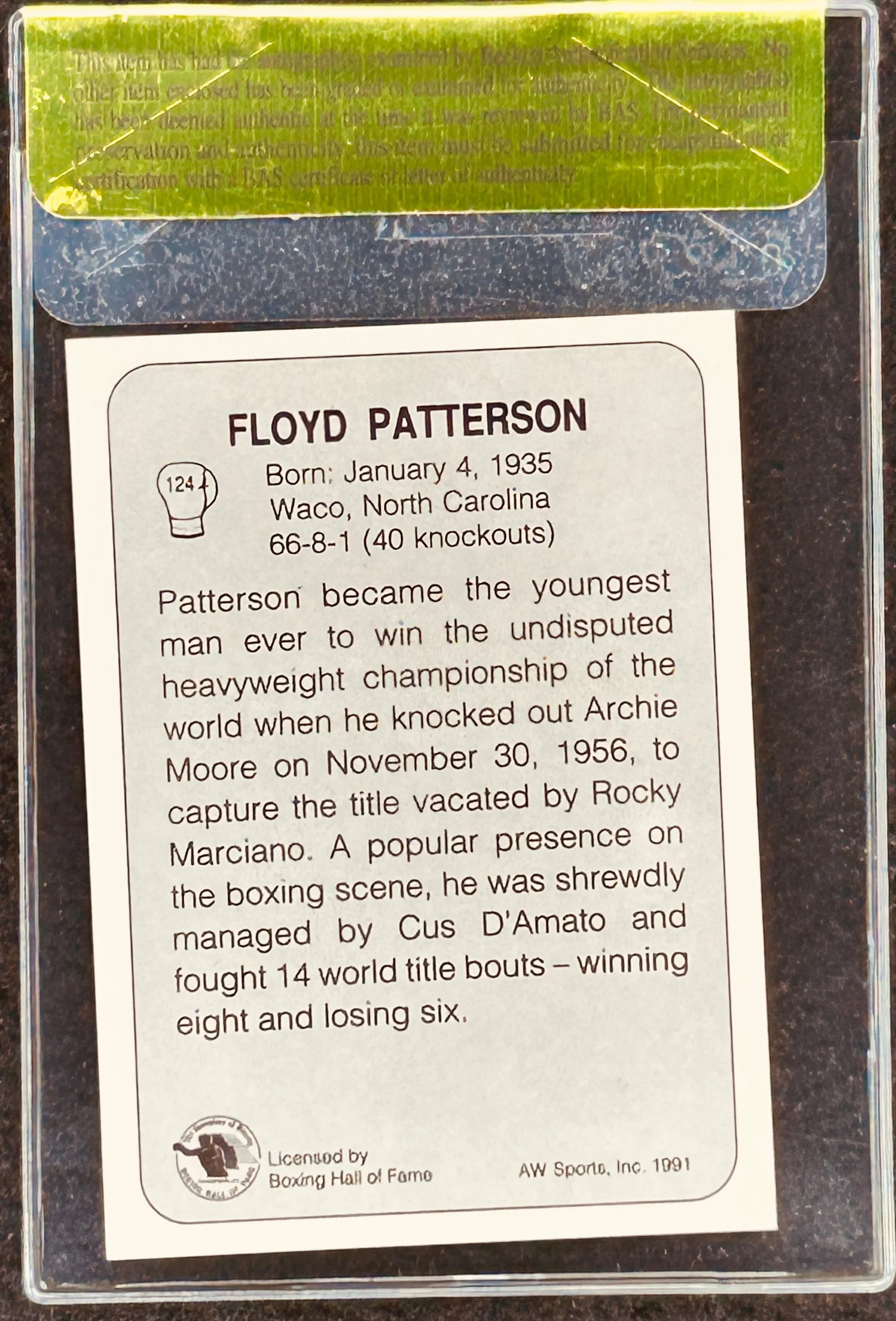 1991 All World boxing card autographed in black Sharpie by the late, great legendary heavyweight boxing champion Floyd Patterson. Authenticated by Beckett Grading Services with their numbered gold foil seal. ONLY ONE AVAILABLE FOR SALE.