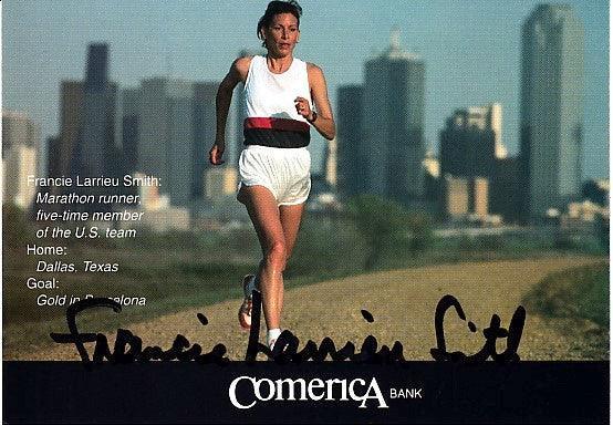 Comerica プロモーション用 4 x 5 1/2 インチ フォト カード 2 枚セット。伝説の長距離ランナー、フランシー ラリュー スミス (オリンピック チームに 5 回出場した最初のアメリカ人) と 1992 年オリンピック ハードラー選手、マクリントン ニールが黒のシャーピーでサインしています。どちらも直接入手しました。AutographsForSale.com 発行の真正証明書付き。販売できるのは 1 セットのみです。