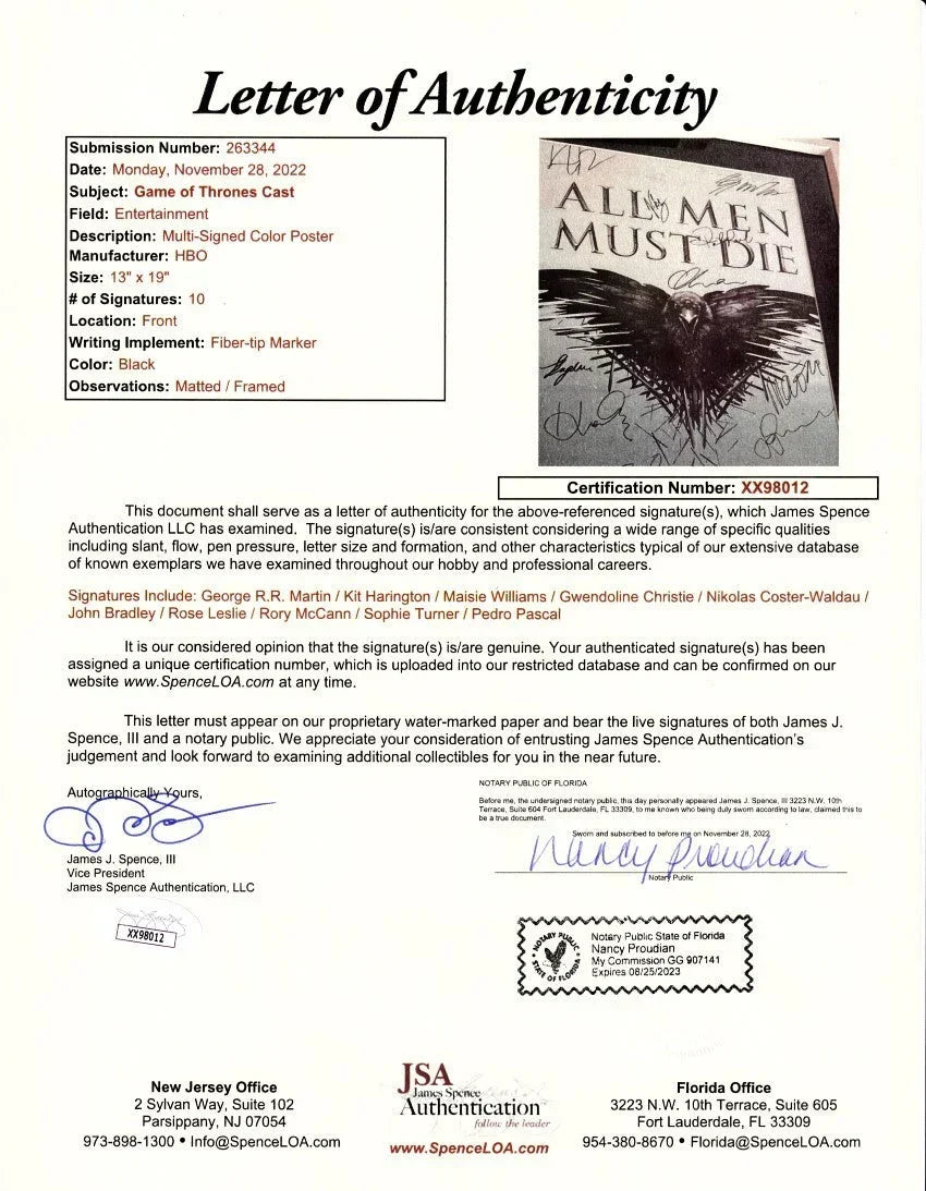 ゲーム・オブ・スローンズ 2014 サンディエゴ コミコン ポスター。著者兼クリエイターのジョージ R. R. マーティンによる黒のシャーピーサイン入り。さらに、キット・ハリントン (ジョン・スノウ)、メイジー・ウィリアムズ (アリア)、グウェンドリン・クリスティ (ブライエニー)、ニコライ・コスター=ワルドー (ジェイミー)、ジョン・ブラッドリー (サムウェル)、ローズ・レスリー (イグリット)、ローリー・マッキャン (ハウンド)、ソフィー・ターナー (サンサ)、ペドロ・パスカル (オベリン) のサイン入り。黒のカスタムマット加工が施され、白木のガラスフレームに入っており、すぐに飾れます。フレームサイズは約 19 x 25 インチ。注: ポスターには小さな傷があります。2014 コミコン限定サイン会で直接入手。サイン会の写真付き。JSA による認証済みで、ポスターが写っている証明書付き。販売できるのは 1 枚のみ。