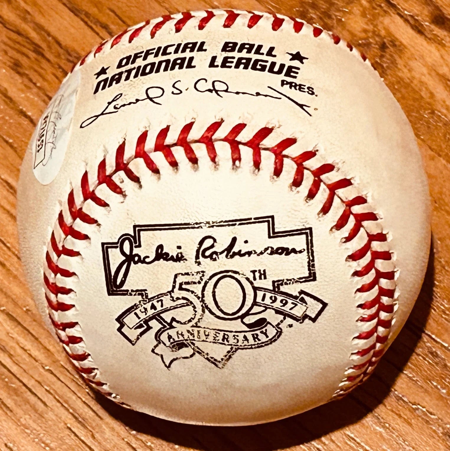 公式ローリングス 1997 ナショナル リーグ ジャッキー ロビンソン記念野球ボール (そのシーズンのみ使用。マダックスは 19 勝 4 敗、防御率 2.20 を記録した)。殿堂入り投手グレッグ マダックスがスイート スポットに青いボールペンでサイン。注意: 経年による変色がごくわずかあり、ジャッキー ロビンソンのロゴが若干擦り切れています。直接入手。JSA による認証済み。ボールには JSA の番号入りステッカーが貼られ、真正性証明書も付いています。販売できるのは 1 個のみです。
