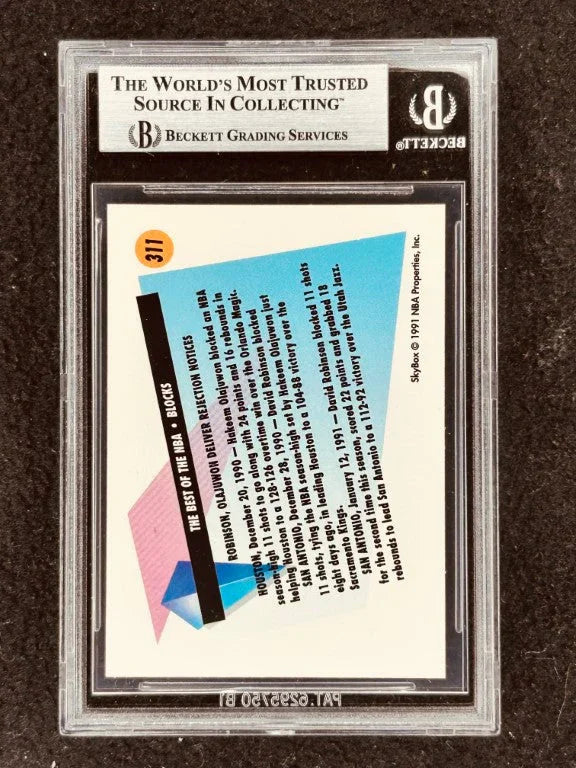 1991-92 スカイボックス カード #311 (ベスト シングル ゲーム パフォーマンス: ブロックス対デビッド ロビンソン) は、ヒューストン ロケッツの伝説的殿堂入り選手、アキーム オラジュワンの黒のシャーピーによるサイン入りで、ベケット認証サービス (BAS) によって刻印および認証されています。販売できるのは 1 枚のみです。