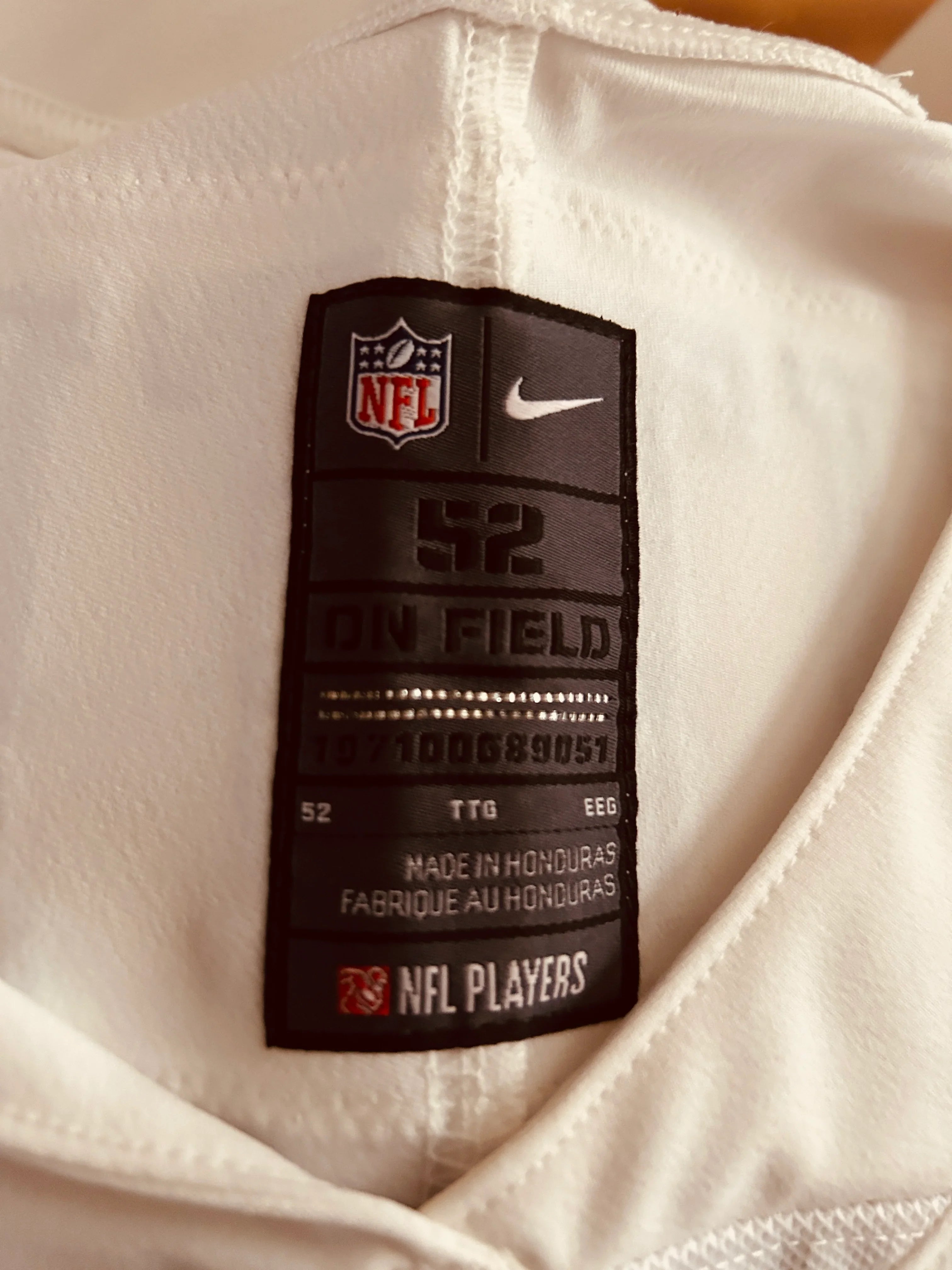 希少なジェイソン・ウィッテン ダラス カウボーイズの本物のナイキ エリート ホーム ホワイト ゲーム モデル ジャージ。縫い付けられた布製タックル ツイル ネーム (オリジナルのネームプレート) と番号、伸縮性のある袖口付き。これは、ウィッテンが 11 回のプロ ボウル シーズンの最後となる 2017 年に着用したのとまったく同じスタイルです。サイズ 52。新品で未使用、紙タグ付きですが、よく見ると左袖の 2 本のストライプのうち 1 本に細いひび割れが見られます。 販売可能なのは 1 つだけです。