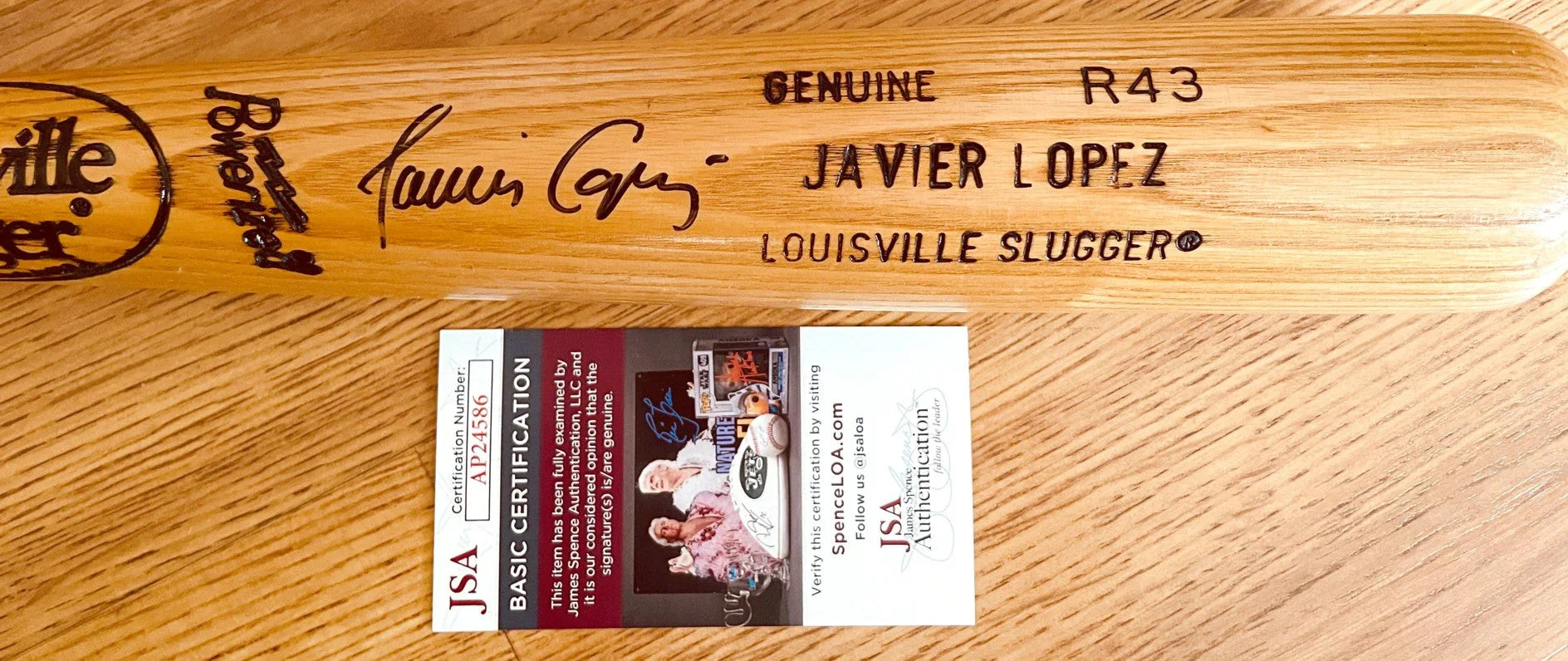 ルイビルスラッガー R43 ゲームモデルバットに、元アトランタ ブレーブスのオールスター捕手、ハビー ロペスが黒のシャーピーで美しくサインしました。JSAによる認証で、バットノブに一致する番号のステッカーと真正性証明書が付いています。バットは完璧な状態です。透明プラスチックのバットチューブが付属。販売できるのは 1 つだけです。