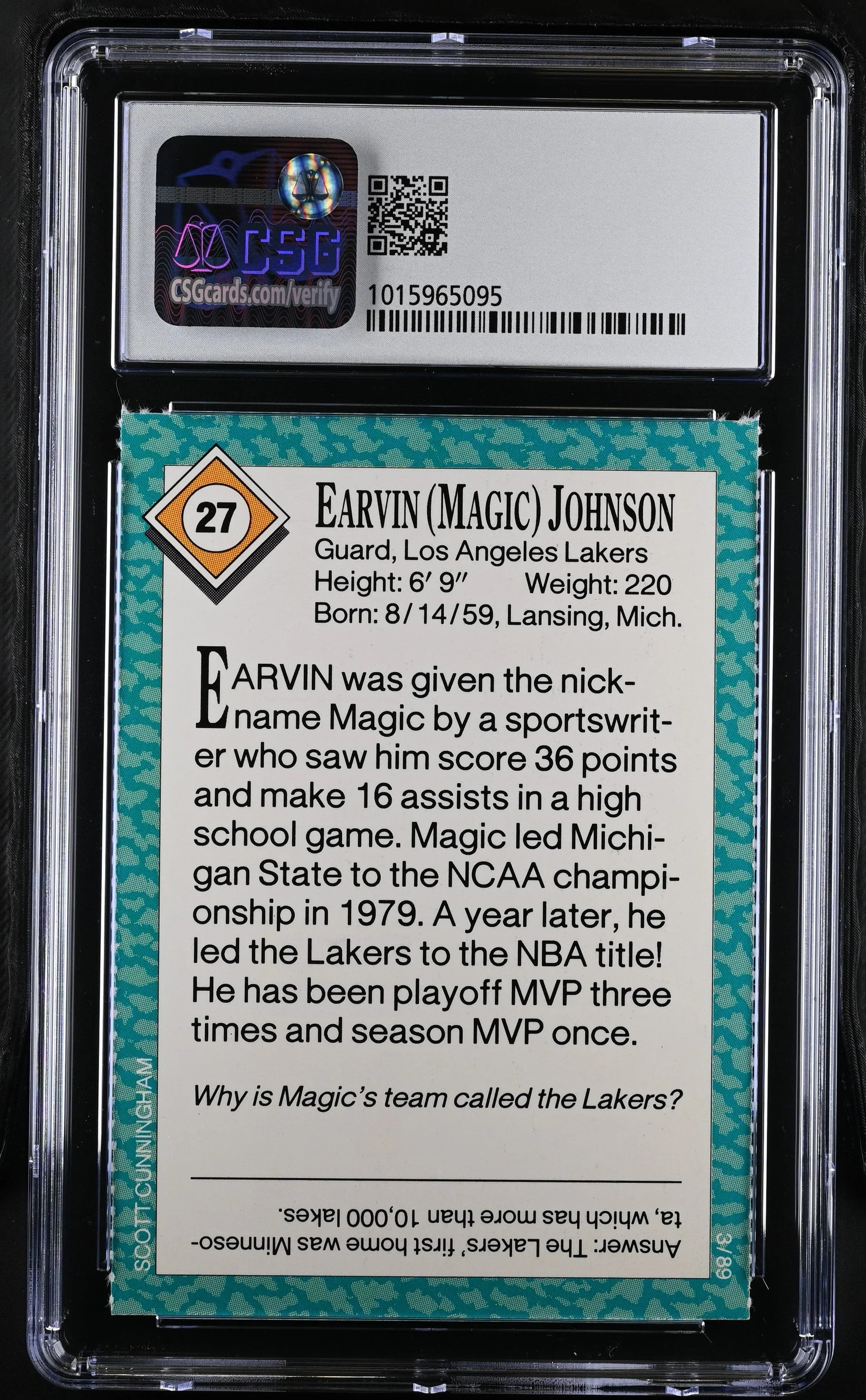 マジック・ジョンソン ロサンゼルス・レイカーズ 1989 Sports Illustrated for Kids カードは、Certified Sports Guaranty によって 8 NrMt-Mt と評価されています。これは、このカードやあらゆる SI for Kids カードとしては非常に高い評価です。