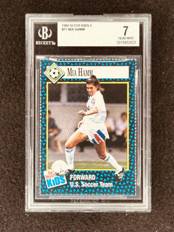 伝説の米国サッカーのスーパースター、ミア・ハムの非常に希少な1992年スポーツ・イラストレイテッド・フォー・キッズ・ルーキーカード。ベケット・グレーディング・サービス(BGS)により7(NrMt)と評価されています。このカードのPSA 10の見本は、2021年6月に34,440ドルで販売されました。販売可能なのは1枚のみです。