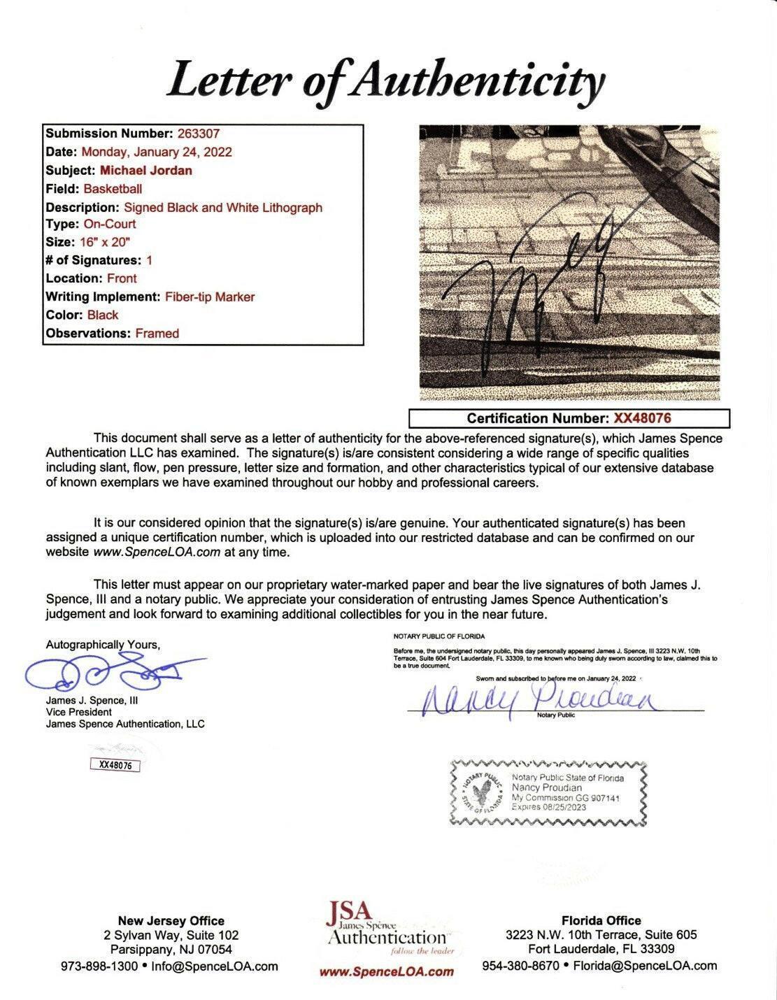 シカゴ ブルズの 16 x 20 インチの白黒点描リトグラフ。伝説のマイケル ジョーダンのサイン入り。プロによるマット加工と額装が施され、すぐに飾れます。額装サイズは約 22 x 27 インチです。このサインは、何年も前にピッツバーグで開催されたマリオ ルミュー セレブリティ ゴルフ トーナメントで直接入手したものです。JSA の認証済みで、サインの写真付きの証明書が付いています。販売できるのは 1 点のみです。
