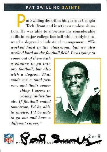 1992 年プロ ライン プロファイル認定の、ジョージア工科大学イエロー ジャケットの元ラインバッカー、パット スウィリングの直筆サイン カード。スウィリングは後にニューオーリンズ セインツのプロ ボウラーになりました。片隅に NFL シール ロゴがエンボス加工されており、本物であることを証明しています。
