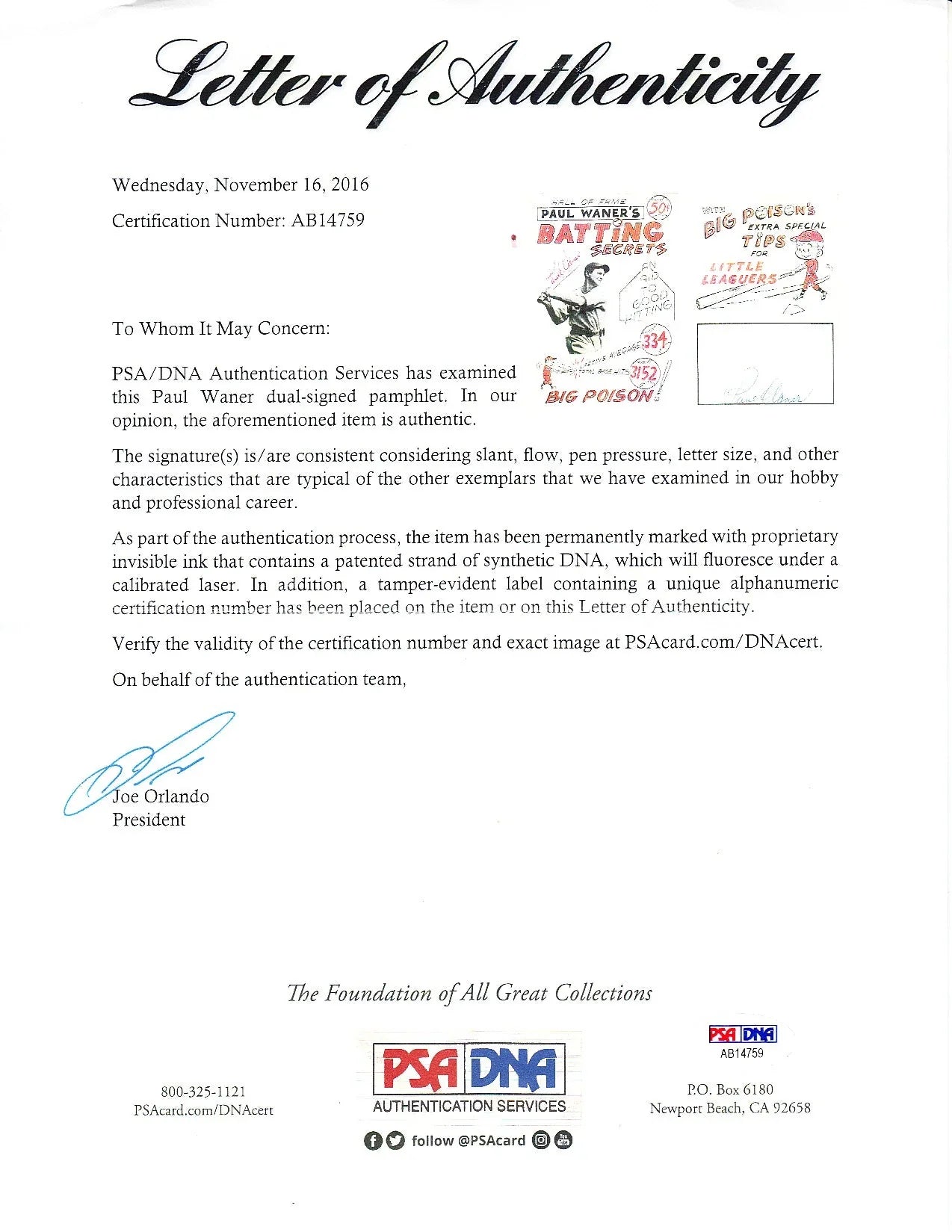 2017 Leaf Executive Collection マスターピース、故ピッツバーグ パイレーツ殿堂入り選手、ポール ワナーとラルフ カイナーの本物のデュアルカット署名カード。PSA/DNA によって認証され、Leaf によってスラブ加工されたユニークな 1/1 カードです。ワナーが同じパンフレットに 2 回署名しており、オリジナルの LOA がすでに送付されているため、オリジナルの PSA/DNA 証明書のコピーが付属します。