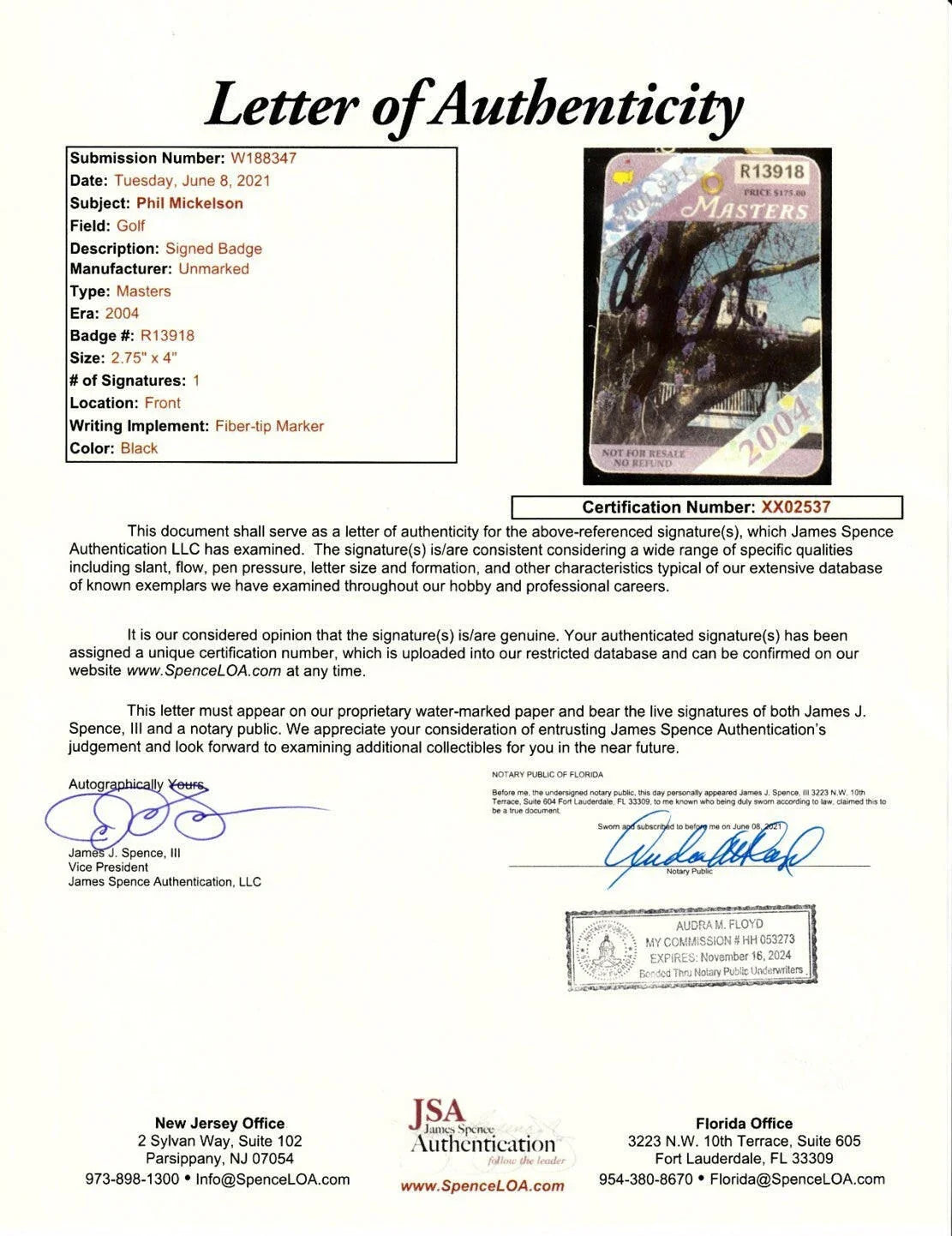 Phil Mickelson autographed 2004 Masters golf badge JSA - AutographsForSale.com