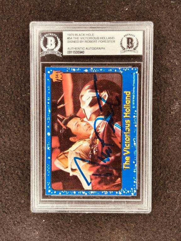1979 年の Topps 映画カード #54 のブラックホールは、故俳優ロバート フォスター (キャプテン ダン ホランド役) によって青いシャーピーでサインされ、ベケット認証サービス (BAS) によって認証され、封入されています。注意: ラベルにロバートの姓のスペルミスがあります。販売できるのは 1 枚のみです。