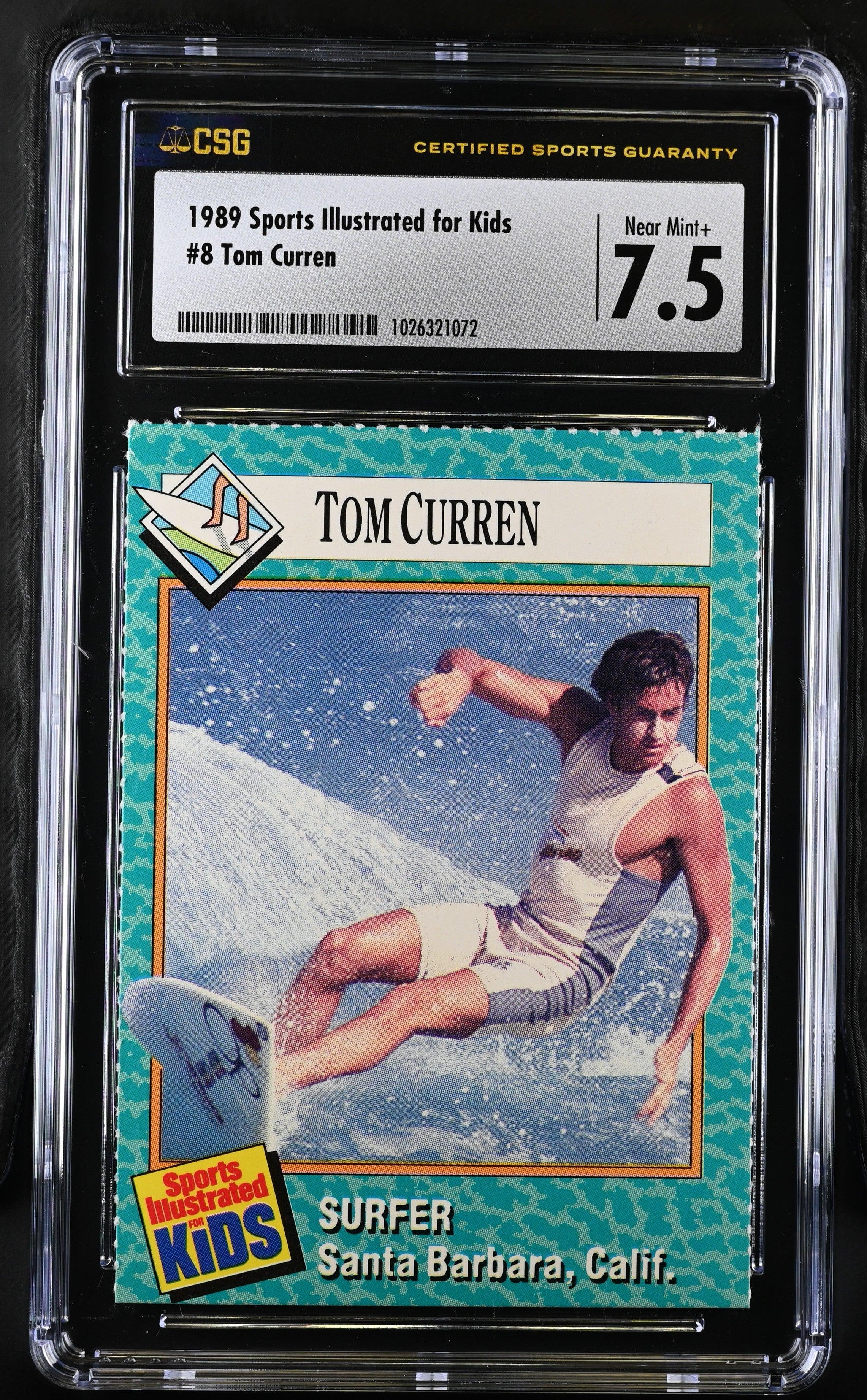 Tom Curren 1989 Sports Illustrated for Kids カードは、Certified Sports Guaranty (CSG) によって 7.5 NrMt+ と評価されています。これは、このカードやあらゆる SI for Kids カードとしては非常に高い評価です。販売可能なのは 1 枚のみです。