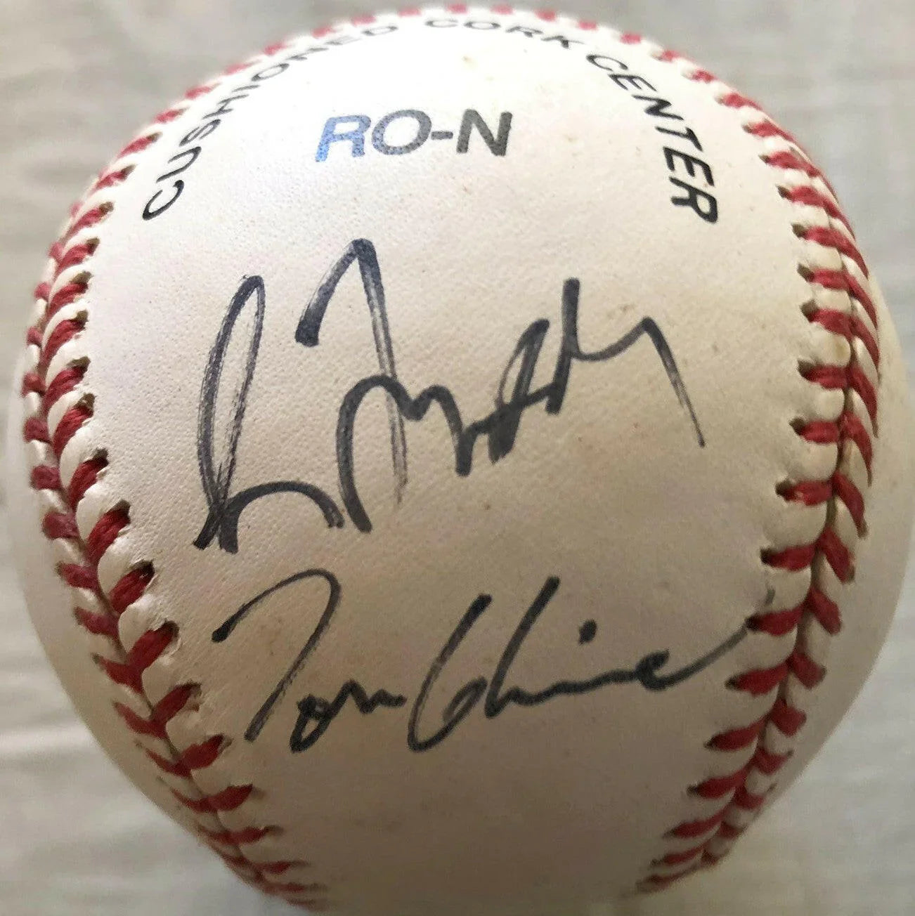 アトランタ ブレーブスの殿堂入り投手トム グラビンとグレッグ マダックスが黒のシャーピーでサインしたローリングス ナショナル リーグ公式野球ボール。サインの付近には経年による若干の変色があります。直接入手したもので、JSA による認証済みです。ボールには JSA の番号入りステッカーが貼られており、真正性証明書も付いています。販売できるのは 1 個のみです。